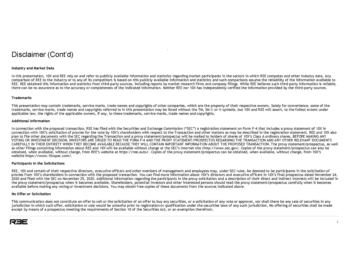 Disclaimer 2 This presentation (the "presentation") is provided for informational purposes only and has been prepared to assist interested parties in making their own evaluation with respect to a potential business combination between REE Automotive Ltd. ("REE") and 10X Capital Venture Acquisition Corp ("10X") and related transactions (the "Transaction") and for no other purpose. No Representations and Warranties This presentation is for informational purposes only and does not purport to contain all of the information that may be required to evaluate the Transaction. This presentation is not intended to form the basis of any investment decision by the recipient and does not constitute investment, tax or legal advice. No representation or warranty, express or implied, is or will be given by 10X or REE or any of their respective affiliates, directors, officers, employees or advisers or any other person as to the accuracy or completeness of the information in this presentation or any other written, oral or other communications transmitted or otherwise made available to any party in the course of its evaluation of a possible transaction between 10X and REE and no responsibility or liability whatsoever is accepted for the accuracy or sufficiency thereof or for any errors, omissions or misstatements, negligent or otherwise, relating thereto. The information contained in this presentation is preliminary in nature and is subject to change, and any such changes may be material. 10X and REE disclaim any duty to update the information contained in this presentation. Viewers of this presentation should each make their own evaluation of REE, 10X and the Transaction and of the adequacy of the information con tai ned herein and should make such other investigations as they deem necessary. Forward - Looking Statements This presentation includes “forward - looking statements” within the meaning of the “safe harbor” provisions of the Private Securities Litigation Reform Act of 1996. 10X’s and REE’s actual results may differ from their expectations, estimates and projections and consequently, you should not rely on these forward - looking statements as predictions of future events. Words such as “expect”, “estimate”, “project”, “budget”, “forecast”, “anticipate”, “intend”, “plan”, “may”, “will”, “could”, “should”, “believes”, “predicts”, “potential”, “continue”, and similar expressions are intended to identify such forward - looking statements. These forward - looking statements include, without limitation, 10X’s and REE’s expectations with respect to future performance and anticipated financial impacts of the Transaction, the satisfaction of closing conditions to the Transaction and the timing of the completion of the Transaction. These forward - looking statements involve significant risks and uncertainties that could cause the actual results to differ materially from the expected results. Most of these factors are outside 10X’s and REE’s control and are difficult to predict. Factors that may cause such differences include, but are not limited to risks related to REE’s projected financial information, including the extent to which projections of revenues and unit sales will reflect actual results in the future, the extent to which REE can actualize the value proposition of the REE products including, but not limited to, cost efficiencies related to its business model with limited capital expenditure requirements and projected total cost of ownership, and the availability of mission - specific vehicles that maximize cabin and storage space on a smaller overall footprint, and other factors described in and related to the risk factor “REE’s projected financial information relies in large part upon internally developed assumptions and analyses, that if proven incorrect could result in significantly lower actual results”, which is included in the registration statement on Form F - 4 filed by REE with the SEC; the outcome of any legal proceedings that may be instituted against 10X or REE following the announcement of the Transaction; the inability to complete the Transaction, including due to the inability to concurrently close the business combination or due to failure to obtain approval of the stockholders of 10X; delays in obtaining, adverse conditions contained in, or the inability to obtain necessary regulatory approvals or complete regular reviews required to complete the Transaction; the risk that the Transaction disrupts current plans and operations as a result of the announcement and consummation of the Transaction; the inability to recognize the anticipated benefits of the Transaction, which may be affected by, among other things, competition, the ability of the combined company to grow and manage growth profitably, maintain relationships with customers and suppliers and retain its key employees; costs related to the Transaction; changes in the applicable laws or regulations; the possibility that the combined company may be adversely affected by other economic, business, and/or competitive factors; the impact of the global COVID - 19 pandemic; and other risks and uncertainties indicated from time to time described in 10X's registration on Form S - 1, the proxy statement and registration statement relating to the Transaction, including those under “Risk Factors” therein, and in 10X and REE’s other filings with the SEC. 10X and REE caution that the foregoing list of factors is not exclusive and not to place undue reliance upon any forward - looking statements, including projections, which speak only as of the date made. Neither 10X nor REE undertakes or accepts any obligation to release publicly any updates or revisions to any forward - looking statements to reflect any change in its expectations or any change in events, conditions or circumstances on which any such statement is based.