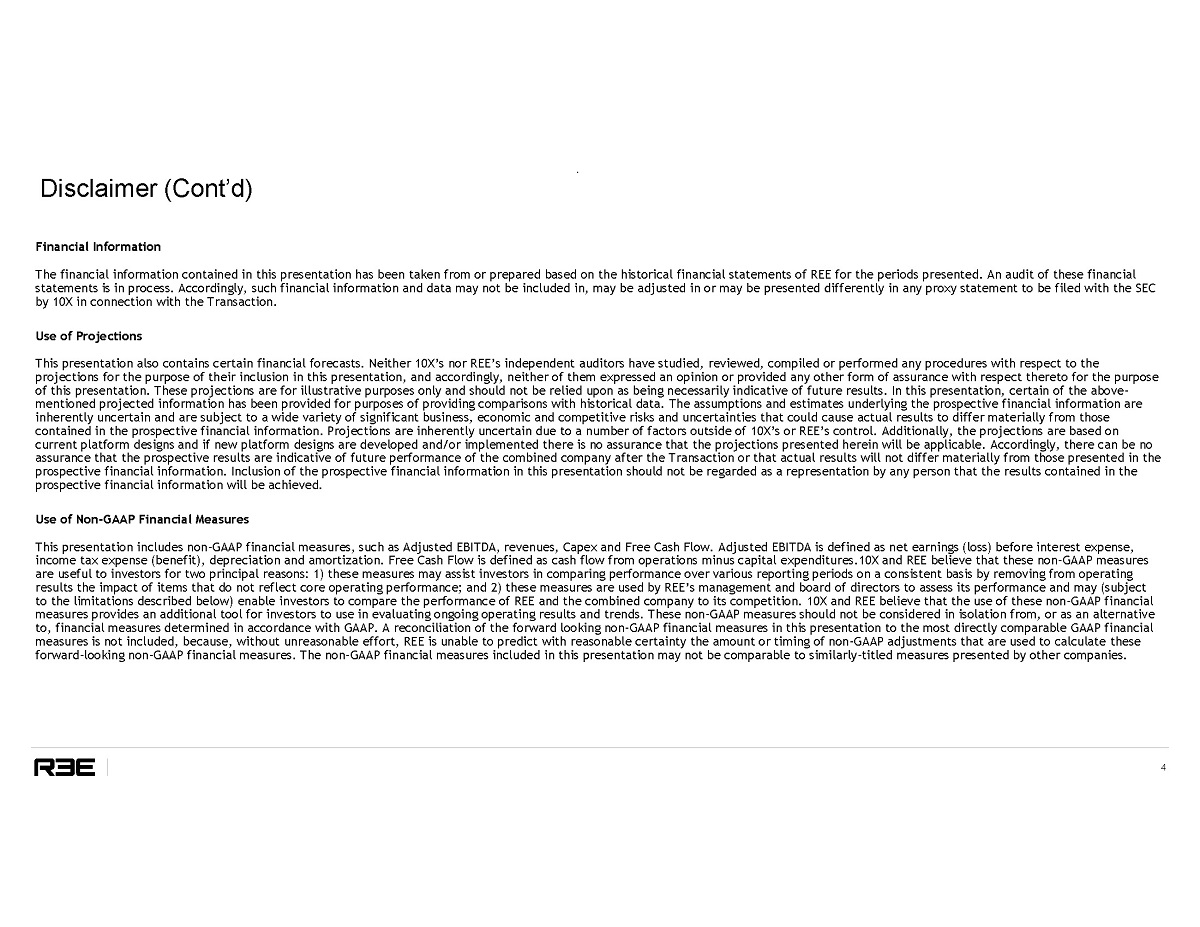 Disclaimer (Cont’d) 3 . Industry and Market Data In this presentation, 10X and REE rely on and refer to publicly available information and statistics regarding market participants in the sectors in which REE competes and other industry data. Any comparison of REE to the industry or to any of its competitors is based on this publicly available information and statistics and such comparisons assume the reliability of the information available to REE. REE obtained this information and statistics from third - party sources, including reports by market research firms and company filings. While REE believes such third - party information is reliable, there can be no assurance as to the accuracy or completeness of the indicated information. Neither REE nor 10X has independently verified the information provided by the third - party sources. Trademarks This presentation may contain trademarks, service marks, trade names and copyrights of other companies, which are the propert y o f their respective owners. Solely for convenience, some of the trademarks, service marks, trade names and copyrights referred to in this presentation may be listed without the TM, SM © or ® symbols, but 10X and REE will assert, to the fullest extent under applicable law, the rights of the applicable owners, if any, to these trademarks, service marks, trade names and copyrights. Additional Information In connection with the proposed transaction, REE has filed with the Securities and Exchange Commission (“SEC”) a registration statement on Form F - 4 that includes a proxy statement of 10X in connection with 10X’s solicitation of proxies for the vote by 10X’s shareholders with respect to the Transaction and other matters as may be described in the registration statement. REE and 10X also plan to file other documents with the SEC regarding the Transaction and a proxy statement/prospectus will be mailed to holders of shares of 10X’s Class A ordinary shares. BEFORE MAKING ANY VOTING OR INVESTMENT DECISION, INVESTORS ARE URGED TO READ THE FORM F - 4 AND THE PROXY STATEMENT/PROSPECTUS REGARDING THE TRANSACTION AND ANY OTHER RELEVANT DOCUMENTS CAREFULLY IN THEIR ENTIRETY WHEN THEY BECOME AVAILABLE BECAUSE THEY WILL CONTAIN IMPORTANT INFORMATION ABOUT THE PROPOSED TRANSACTION. The proxy statement/prospectus, as well as other filings containing information about REE and 10X will be available without charge at the SEC’s Internet site (http://www.sec.gov). Copies of the proxy statement/prospectus can also be obtained, when available, without charge, from REE’s website at https://ree.auto/. Copies of the proxy statement/prospectus can be obtained, when available, without charge, from 10X’s website https:// www.10xspac.com/. Participants in the Solicitations REE, 10X and certain of their respective directors, executive officers and other members of management and employees may, under SEC rules, be deemed to be participants in the solicitation of proxies from 10X’s shareholders in connection with the proposed transaction. You can find more information about 10X’s directors and executive officers in 10X’s final prospectus dated November 24, 2020 and filed with the SEC on November 25, 2020. Additional information regarding the participants in the proxy solicitation and a description of their direct and indirect interests will be included in the proxy statement/prospectus when it becomes available. Shareholders, potential investors and other interested persons should read the proxy statement/prospectus carefully when it becomes available before making any voting or investment decisions. You may obtain free copies of these documents from the sources indicated above. No Offer or Solicitation This communication does not constitute an offer to sell or the solicitation of an offer to buy any securities, or a solicitation of any vote or approval, nor shall there be any sale of securities in any jurisdiction in which such offer, solicitation or sale would be unlawful prior to registration or qualification under the securities laws of any such jurisdiction. No offering of securities shall be made except by means of a prospectus meeting the requirements of Section 10 of the Securities Act, or an exemption therefrom.