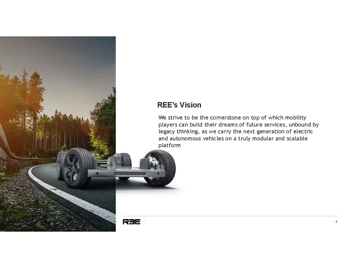 Disclaimer (Cont’d) 4 . Financial Information The financial information contained in this presentation has been taken from or prepared based on the historical financial statements of REE for the periods presented. An audit of these financial statements is in process. Accordingly, such financial information and data may not be included in, may be adjusted in or may be presented differently in any proxy statement to be filed with the SEC by 10X in connection with the Transaction. Use of Projections This presentation also contains certain financial forecasts. Neither 10X’s nor REE’s independent auditors have studied, reviewed, compiled or performed any procedures with respect to the projections for the purpose of their inclusion in this presentation, and accordingly, neither of them expressed an opinion or provided any other form of assurance with respect thereto for the purpose of this presentation. These projections are for illustrative purposes only and should not be relied upon as being necessarily indicative of future results. In this presentation, certain of the above - mentioned projected information has been provided for purposes of providing comparisons with historical data. The assumptions and estimates underlying the prospective financial information are inherently uncertain and are subject to a wide variety of significant business, economic and competitive risks and uncertainties that could cause actual results to differ materially from those contained in the prospective financial information. Projections are inherently uncertain due to a number of factors outside of 10X’s or REE’s control. Additionally, the projections are based on current platform designs and if new platform designs are developed and/or implemented there is no assurance that the projections presented herein will be applicable. Accordingly, there can be no assurance that the prospective results are indicative of future performance of the combined company after the Transaction or that actual results will not differ materially from those presented in the prospective financial information. Inclusion of the prospective financial information in this presentation should not be regarded as a representation by any person that the results contained in the prospective financial information will be achieved. Use of Non - GAAP Financial Measures This presentation includes non - GAAP financial measures, such as Adjusted EBITDA, revenues, Capex and Free Cash Flow. Adjusted EBITDA is defined as net earnings (loss) before interest expense, income tax expense (benefit), depreciation and amortization. Free Cash Flow is defined as cash flow from operations minus capital expenditures.10X and REE believe that these non - GAAP measures are useful to investors for two principal reasons: 1) these measures may assist investors in comparing performance over various reporting periods on a consistent basis by removing from operating results the impact of items that do not reflect core operating performance; and 2) these measures are used by REE’s management and board of directors to assess its performance and may (subject to the limitations described below) enable investors to compare the performance of REE and the combined company to its competition. 10X and REE believe that the use of these non - GAAP financial measures provides an additional tool for investors to use in evaluating ongoing operating results and trends. These non - GAAP measures should not be considered in isolation from, or as an alternative to, financial measures determined in accordance with GAAP. A reconciliation of the forward looking non - GAAP financial measures in this presentation to the most directly comparable GAAP financial measures is not included, because, without unreasonable effort, REE is unable to predict with reasonable certainty the amount or timing of non - GAAP adjustments that are used to calculate these forward - looking non - GAAP financial measures. The non - GAAP financial measures included in this presentation may not be comparable to similarly - titled measures presented by other companies.