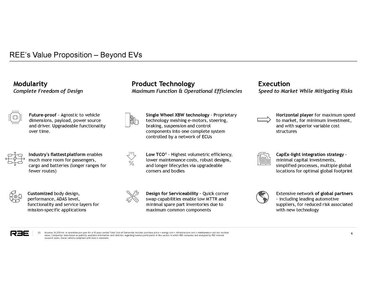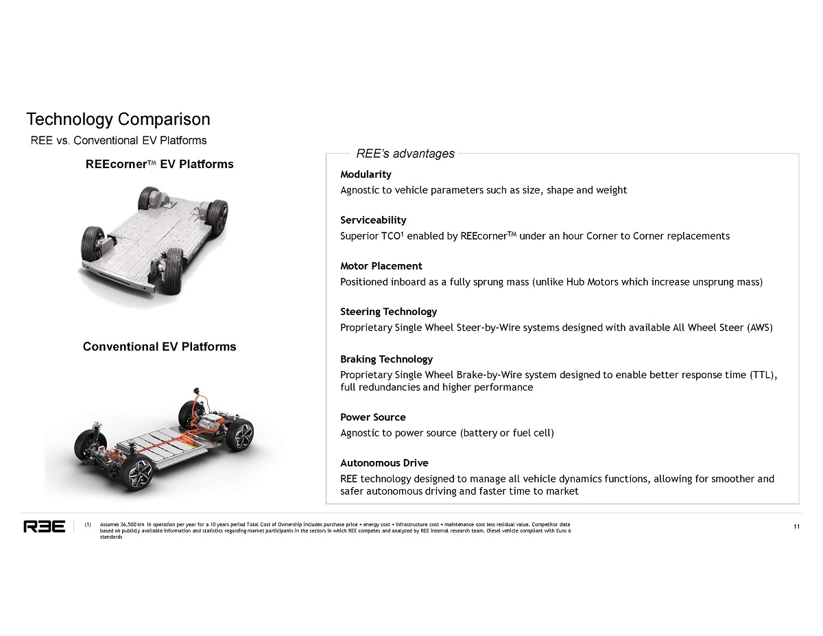 Technology Comparison 1 1 REE vs. Conventional EV Platforms ( 1 ) Assumes 36 , 500 km in operation per year for a 10 years period Total Cost of Ownership includes purchase price + e nergy cost + infrastructure cost + maintenance cost less residual value . Competitor data based on publicly available information and statistics regarding market participants in the sectors in which REE competes and analyzed by REE internal research team . Diesel vehicle compliant with Euro 6 standards REEcorner TM EV Platforms Conventional EV Platforms Braking Technology Proprietary Single Wheel Brake - by - Wire system designed to enable better response time (TTL), full redundancies and higher performance P o w e r S o u r c e Agnostic to power source (battery or fuel cell) Autonomous Drive REE technology designed to manage all vehicle dynamics functions, allowing for smoother and safer autonomous driving and faster time to market REE’s advantages Modularity Agnostic to vehicle parameters such as size, shape and weight Serviceability Superior TCO 1 enabled by REEcorner TM under an hour Corner to Corner replacements Motor Placement Positioned inboard as a fully sprung mass (unlike Hub Motors which increase unsprung mass) Steering Technology Proprietary Single Wheel Steer - by - Wire systems designed with available All Wheel Steer (AWS)