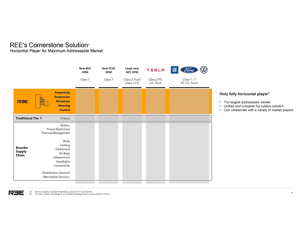 6 Modularity Complete Freedom of Design Product Technology Maximum Function & Operational Efficiencies Execution Speed to Market While Mitigating Risks Future - proof – Agnostic to vehicle dimensions, payload, power source and driver. Upgradeable functionality over time. Design for Serviceability – Quick corner swap capabilities enable low MTTR and minimal spare part inventories due to maximum common components Industry's flattest platform enables much more room for passengers, cargo and batteries (longer ranges for fewer routes) Horizontal player for maximum speed to market, for minimum investment, and with superior variable cost structures Extensive network of global partners – including leading automotive suppliers, for reduced risk associated with new technology Single Wheel XBW technology – Proprietary technology meshing e - motors, steering, braking, suspension and control components into one complete system controlled by a network of ECUs Low TCO 1 – Highest volumetric efficiency, lower maintenance costs, robust designs, and longer lifecycles via upgradeable corners and bodies Customized body design, p e r f o r m an c e , A D AS l ev e l , functionality and service layers for mission - specific applications CapEx - light integration strategy – minimal capital investments, simplified processes, multiple global locations for optimal global footprint (1) Assumes 36,500 km in operation per year for a 10 years period Total Cost of Ownership includes purchase price + e nergy cost + infrastructure cost + maintenance cost less residual value. Competitor data based on publicly available information and statistics regarding market participants in the sectors in which REE competes and analyzed by REE internal research team. Diesel vehicle compliant with Euro 6 standards REE’s Value Proposition – Beyond EVs