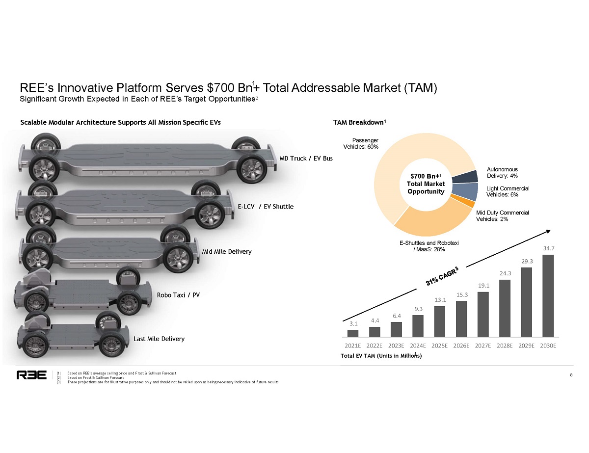 Only fully horizontal player 2 • The largest addressable market • Unified and complete full system solution • Can collaborate with a variety of market players R EE ' s C o r n e r s to n e S o l u t i o n 1 Horizontal Player for Maximum Addressable Market 7 (1) Based on publicly available information, based on US classifications (2) See slide : Unique Technology & Go - To - Market Strategy Relative to New Mobility Players