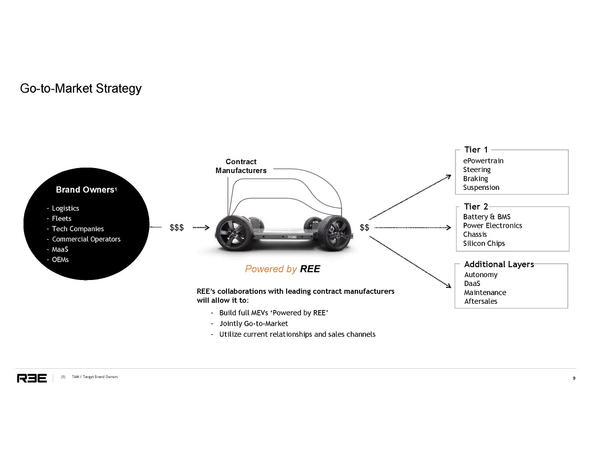 (1) Based on REE’s average selling price and Frost & Sullivan Forecast (2) Based on Frost & Sullivan Forecast (3) These projections are for illustrative purposes only and should not be relied upon as being necessary indicative of future results R EE ’ s I nno v a t i ve P l a t f o r m S e r v e s $70 0 B n 1 + T o t a l Ad d r e ss a b l e M a r k e t ( T A M) Significant Growth Expected in Each of REE’s Target Opportunities 2 A u t ono m o u s Delivery: 4% Ligh t Co mm er c i a l Vehicles: 6% M i d Du ty C o mm e r c ia l Vehicles: 2% E - Shuttles and Robotaxi / MaaS: 28% 8 $700 Bn+ 1 Total Market O ppo r tu n i ty P a ss en g e r V ehi c l e s: 60% MD Truck / EV Bus TAM Breakdown 1 Scalable Modular Architecture Supports All Mission Specific EVs E - LCV / EV Shuttle Mid Mile Delivery Robo Taxi / PV Last Mile Delivery 3 . 1 4 . 4 6 . 4 9 . 3 1 3 . 1 1 5 . 3 1 9 . 1 2 9 . 3 24.3 3 4 . 7 2021E 2022E 2023E 2024E 2025E 2026E 2027E 2028E 2029E 2030E Total EV TAM (Units in Million 1 s)
