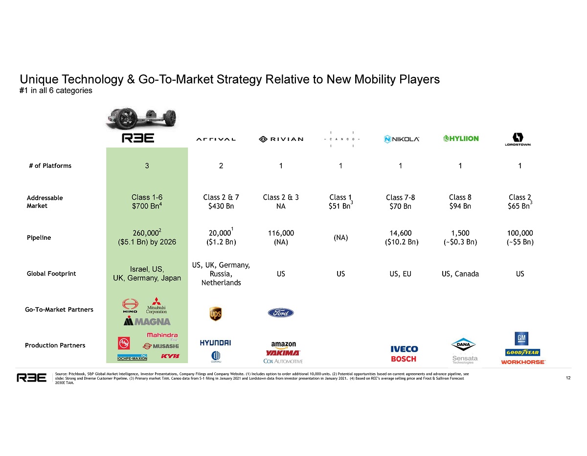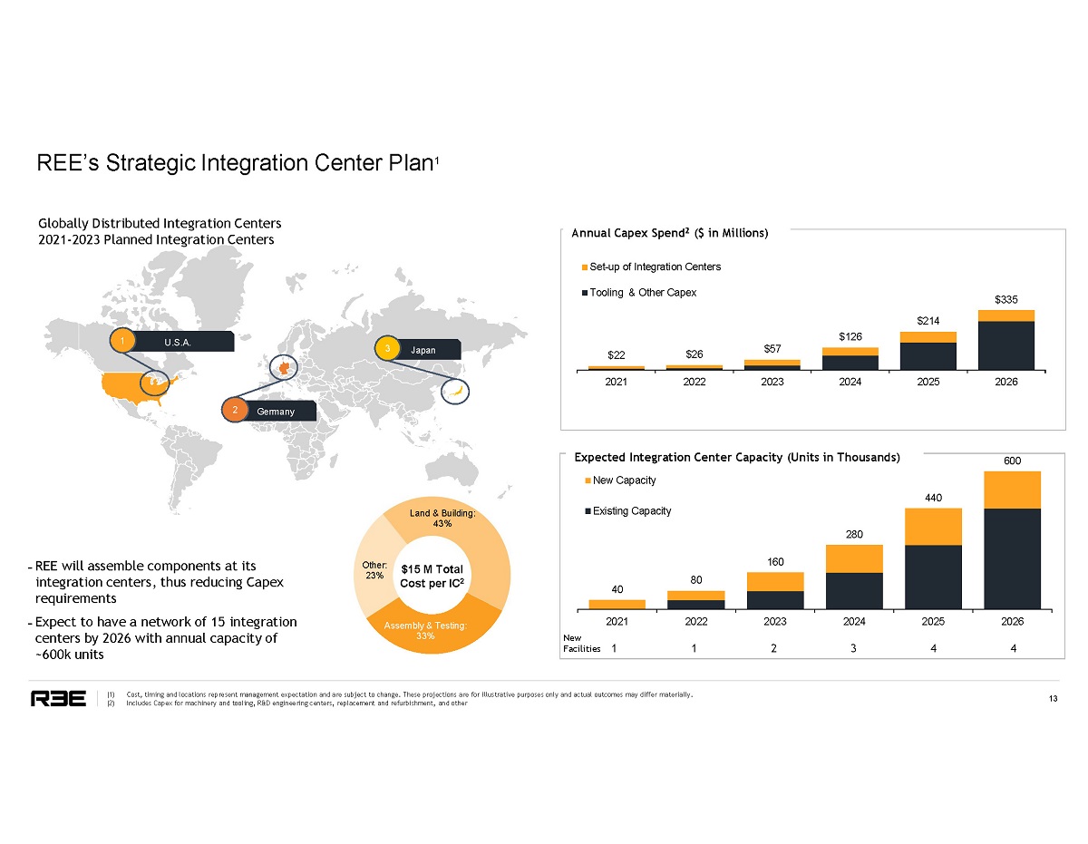 2 1 1 1 1 1 Class 2 & 7 $43 0 Bn Class 2 & 3 NA C l a s s 1 $5 1 B n 3 C l a s s 7 - 8 $70 Bn C l a s s 8 $9 4 B n C l a s s 2 $6 5 B n 3 20 , 0 0 0 1 ( $1 . 2 B n) 116 , 00 0 (NA) ( NA) 14,600 ( $10 . 2 B n) 1,500 ( ~$0 . 3 B n) 100,000 ( ~$ 5 B n) US, UK, Germany, Russia, Netherlands US US U S , E U US, Canada US # of Platforms 3 Cl a s s 1 - 6 $ 7 0 0 B n 4 260,000 2 ($5.1 Bn) by 2026 Israel, US, UK, Germany, Japan A d d r ess a b l e Market Pipeline Global Footprint Go - To - Market Partners Production Partners Unique Technology & Go - To - Market Strategy Relative to New Mobility Players #1 in all 6 categories 12 Source: Pitchbook, S&P Global Market Intelligence, Investor Presentations, Company Filings and Company Website. (1) Includes option to order additional 10,000 units. (2) Potential opportunities based on current agreements and advance pipeline, see slide: Strong and Diverse Customer Pipeline. (3) Primary market TAM. Canoo data from S - 1 filing in January 2021 and Lordstown data from investor presentation in January 2021. (4) Based on REE’s average selling price and Frost & Sullivan Forecast 2030E TAM.