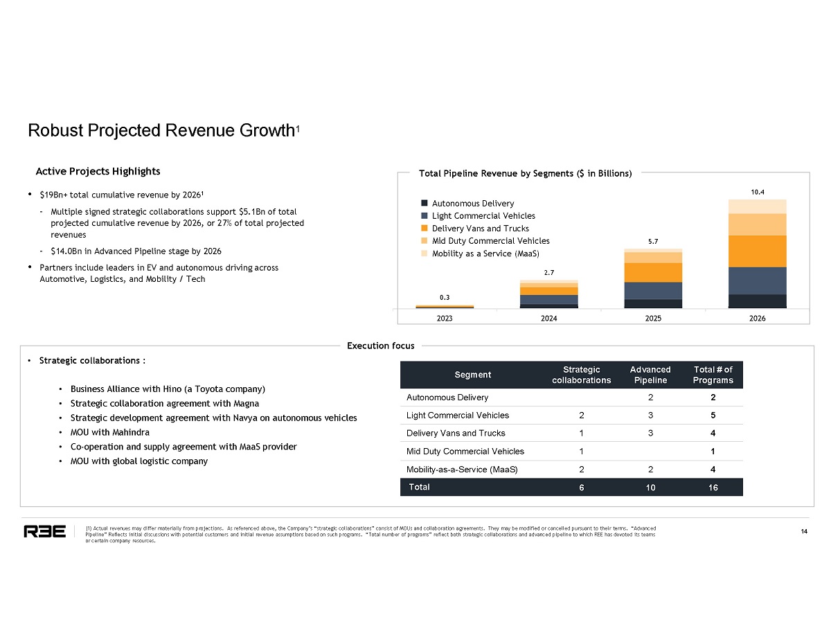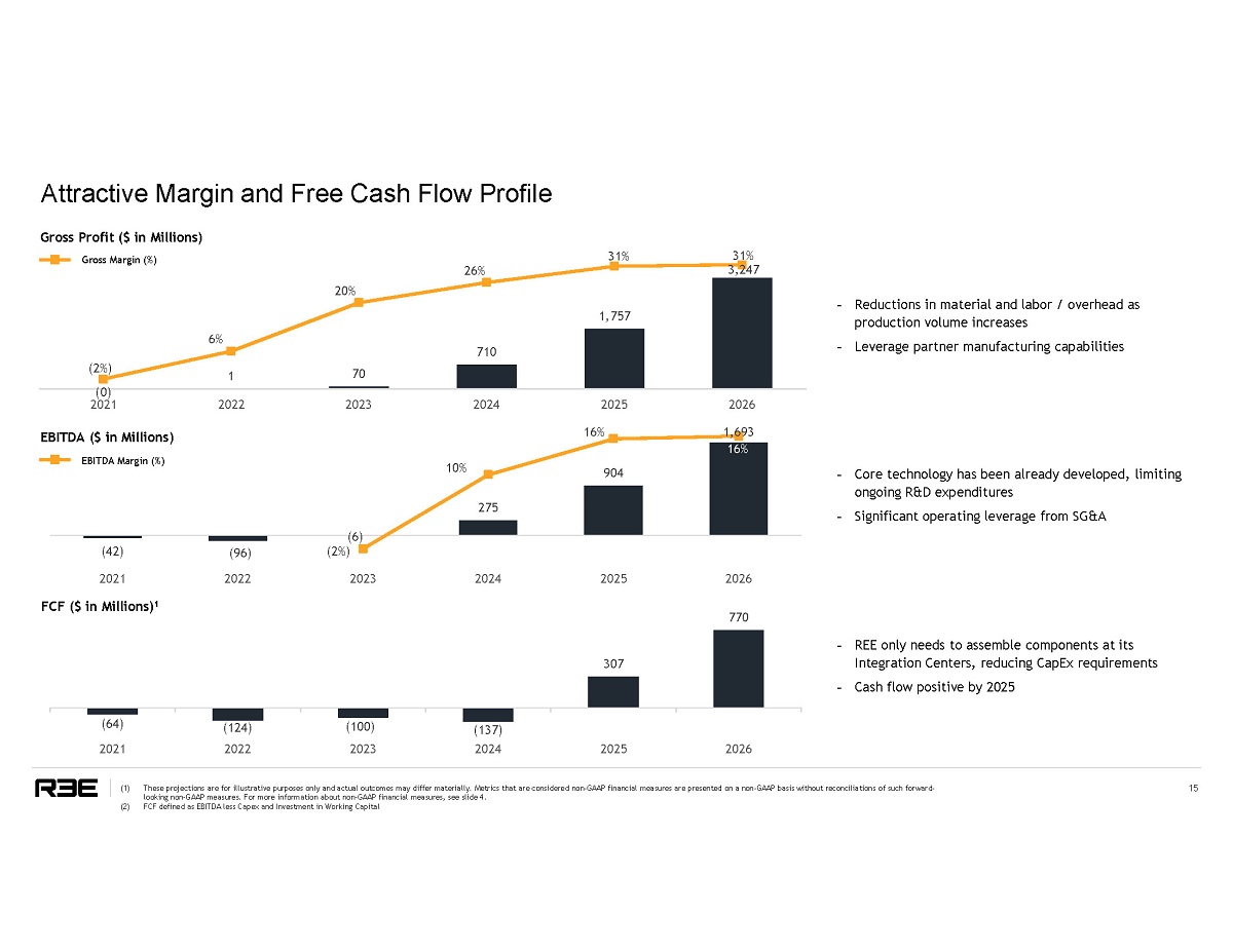 Robust Projected Revenue Growth 1 14 Active Projects Highlights 0 . 3 2 . 7 5 . 7 1 0.4 2 0 2 3 2 0 2 4 2 0 2 5 2 0 2 6 Autonomous Delivery Light Commercial Vehicles Delivery Vans and Trucks Mid Duty Commercial Vehicles Mobility as a Service (MaaS) • $19Bn+ total cumulative revenue by 2026 1 – Multiple signed strategic collaborations support $5.1Bn of total projected cumulative revenue by 2026, or 27% of total projected revenues – $14.0Bn in Advanced Pipeline stage by 2026 • Partners include leaders in EV and autonomous driving across Automotive, Logistics, and Mobility / Tech Total Pipeline Revenue by Segments ($ in Billions) S e gmen t S t r a t eg ic Advanced Total # of Autonomous Delivery collaborations Pipeline 2 Programs 2 Light Commercial Vehicles 2 3 5 Delivery Vans and Trucks 1 3 4 Mid Duty Commercial Vehicles 1 1 Mobility - as - a - Service (MaaS) 2 2 4 Total 6 10 16 • Strategic collaborations : • Business Alliance with Hino (a Toyota company) • Strategic collaboration agreement with Magna • Strategic development agreement with Navya on autonomous vehicles • MOU with Mahindra • Co - operation and supply agreement with MaaS provider • MOU with global logistic company Execution focus ( 1 ) Actual revenues may differ materially from projections . As referenced above, the Company’s “strategic collaborations” consist of MOUs and collaboration agreements . They may be modified or cancelled pursuant to their terms . “Advanced Pipeline” Reflects initial discussions with potential customers and initial revenue assumptions based on such programs . “Total number of programs” reflect both strategic collaborations and advanced pipeline to which REE has devoted its teams or certain company resources .