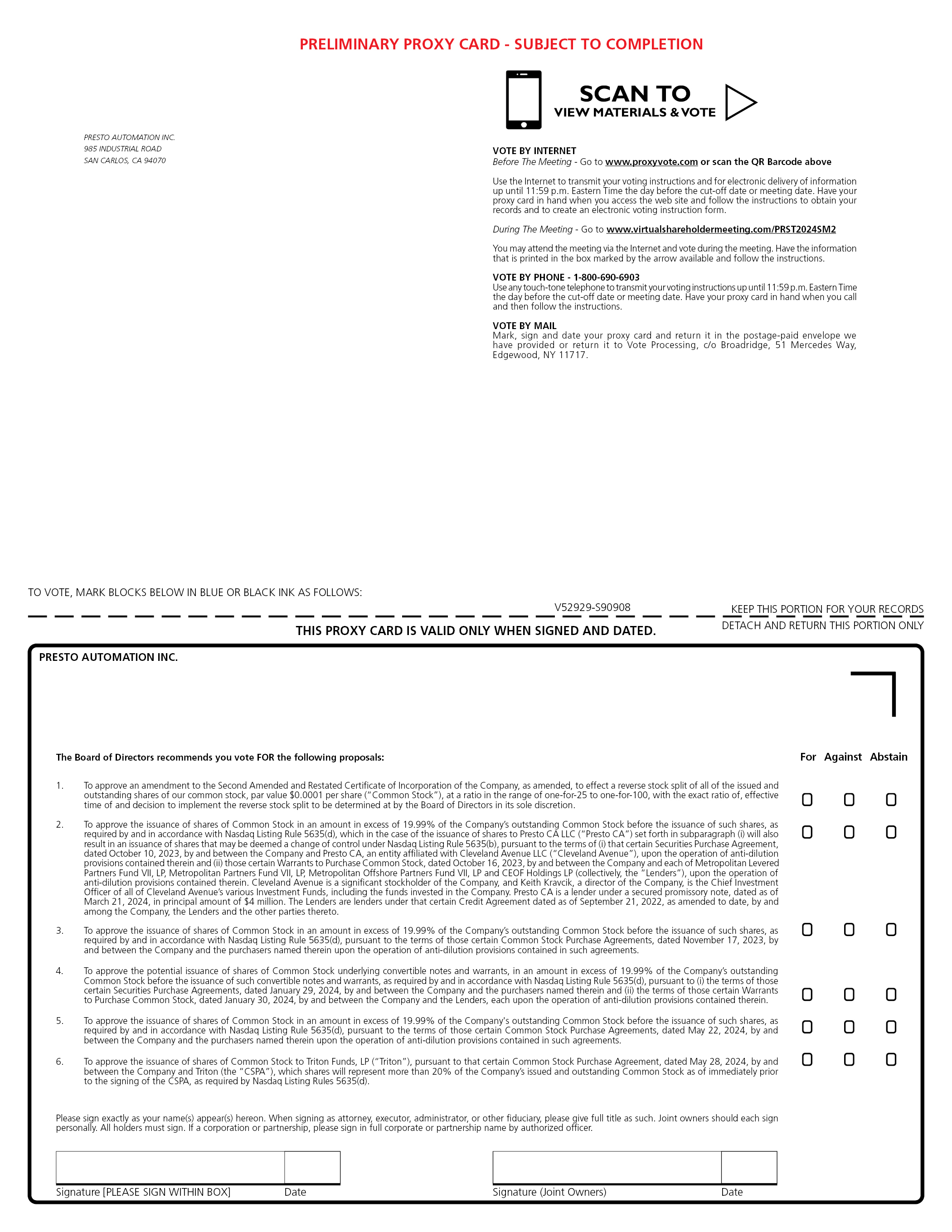 PRELIMINARY PROXY CARD - SUBJECT TO COMPLETION PRESTO AUTOMATION INC. 985 INDUSTRIAL ROAD SAN CARLOS, CA 94070 SCAN TO VIEW MATERIALS & VOTE VOTE BY INTERNET Before The Meeting - Go to www.proxyvote.com or scan the QR Barcode above Use the Internet to transmit your voting instructions and for electronic delivery of information up until 11:59 p.m. Eastern Time the day before the cut-off date or meeting date. Have your proxy card in hand when you access the web site and follow the instructions to obtain your records and to create an electronic voting instruction form. During The Meeting - Go to www.virtualshareholdermeeting.com/PRST2024SM2 You may attend the meeting via the Internet and vote during the meeting. Have the information that is printed in the box marked by the arrow available and follow the instructions. VOTE BY PHONE - 1-800-690-6903 Use any touch-tone telephone to transmit your voting instructions up until 11:59 p.m. Eastern Time the day before the cut-off date or meeting date. Have your proxy card in hand when you call and then follow the instructions. VOTE BY MAIL Mark, sign and date your proxy card and return it in the postage-paid envelope we have provided or return it to Vote Processing, c/o Broadridge, 51 Mercedes Way, Edgewood, NY 11717. TO VOTE, MARK BLOCKS BELOW IN BLUE OR BLACK INK AS FOLLOWS: V52929-S90908 KEEP THIS PORTION FOR YOUR RECORDS THIS PROXY CARD IS VALID ONLY WHEN SIGNED AND DATED. DETACH AND RETURN THIS PORTION ONLY PRESTO AUTOMATION INC. The Board of Directors recommends you vote FOR the following proposals: For Against Abstain 1. To approve an amendment to the Second Amended and Restated Certificate of Incorporation of the Company, as amended, to effect a reverse stock split of all of the issued and outstanding shares of our common stock, par value $0.0001 per share (“Common Stock”), at a ratio in the range of one-for-25 to one-for-100, with the exact ratio of, effective time of and decision to implement the reverse stock split to be determined at by the Board of Directors in its sole discretion. 2. To approve the issuance of shares of Common Stock in an amount in excess of 19.99% of the Company’s outstanding Common Stock before the issuance of such shares, as required by and in accordance with Nasdaq Listing Rule 5635(d), which in the case of the issuance of shares to Presto CA LLC (“Presto CA”) set forth in subparagraph (i) will also result in an issuance of shares that may be deemed a change of control under Nasdaq Listing Rule 5635(b), pursuant to the terms of (i) that certain Securities Purchase Agreement, dated October 10, 2023, by and between the Company and Presto CA, an entity affiliated with Cleveland Avenue LLC (“Cleveland Avenue”), upon the operation of anti-dilution provisions contained therein and (ii) those certain Warrants to Purchase Common Stock, dated October 16, 2023, by and between the Company and each of Metropolitan Levered Partners Fund VII, LP, Metropolitan Partners Fund VII, LP, Metropolitan Offshore Partners Fund VII, LP and CEOF Holdings LP (collectively, the “Lenders”), upon the operation of anti-dilution provisions contained therein. Cleveland Avenue is a significant stockholder of the Company, and Keith Kravcik, a director of the Company, is the Chief Investment Officer of all of Cleveland Avenue’s various Investment Funds, including the funds invested in the Company. Presto CA is a lender under a secured promissory note, dated as of March 21, 2024, in principal amount of $4 million. The Lenders are lenders under that certain Credit Agreement dated as of September 21, 2022, as amended to date, by and among the Company, the Lenders and the other parties thereto. 3. To approve the issuance of shares of Common Stock in an amount in excess of 19.99% of the Company’s outstanding Common Stock before the issuance of such shares, as required by and in accordance with Nasdaq Listing Rule 5635(d), pursuant to the terms of those certain Common Stock Purchase Agreements, dated November 17, 2023, by and between the Company and the purchasers named therein upon the operation of anti-dilution provisions contained in such agreements. 4. To approve the potential issuance of shares of Common Stock underlying convertible notes and warrants, in an amount in excess of 19.99% of the Company’s outstanding Common Stock before the issuance of such convertible notes and warrants, as required by and in accordance with Nasdaq Listing Rule 5635(d), pursuant to (i) the terms of those certain Securities Purchase Agreements, dated January 29, 2024, by and between the Company and the purchasers named therein and (ii) the terms of those certain Warrants to Purchase Common Stock, dated January 30, 2024, by and between the Company and the Lenders, each upon the operation of anti-dilution provisions contained therein. 5. To approve the issuance of shares of Common Stock in an amount in excess of 19.99% of the Company’s outstanding Common Stock before the issuance of such shares, as required by and in accordance with Nasdaq Listing Rule 5635(d), pursuant to the terms of those certain Common Stock Purchase Agreements, dated May 22, 2024, by and between the Company and the purchasers named therein upon the operation of anti-dilution provisions contained in such agreements. 6. To approve the issuance of shares of Common Stock to Triton Funds, LP (“Triton”), pursuant to that certain Common Stock Purchase Agreement, dated May 28, 2024, by and between the Company and Triton (the “CSPA”), which shares will represent more than 20% of the Company’s issued and outstanding Common Stock as of immediately prior to the signing of the CSPA, as required by Nasdaq Listing Rules 5635(d). Please sign exactly as your name(s) appear(s) hereon. When signing as attorney, executor, administrator, or other fiduciary, please give full title as such. Joint owners should each sign personally. All holders must sign. If a corporation or partnership, pl