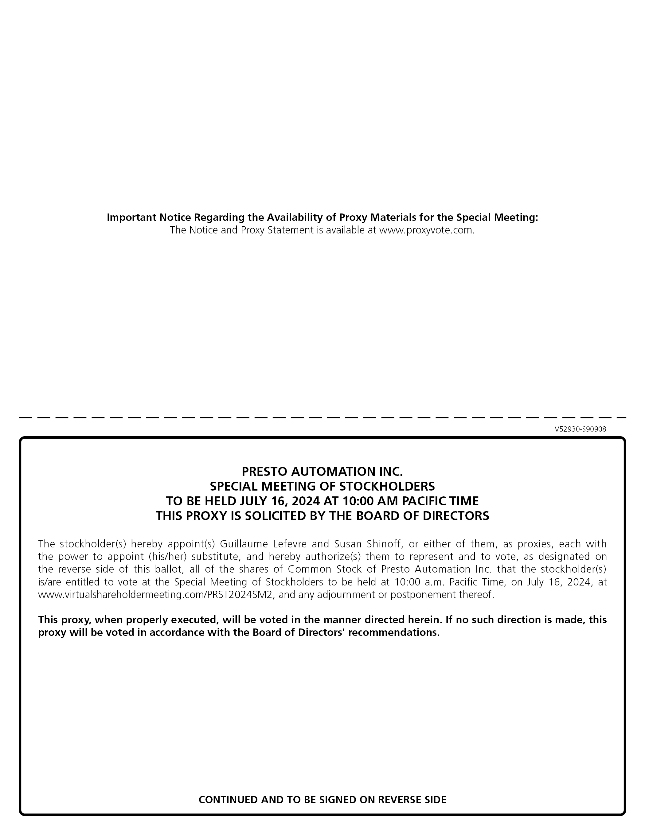 Important Notice Regarding the Availability of Proxy Materials for the Special Meeting:The Notice and Proxy Statement is available at www.proxyvote.com. V52930-S90908 PRESTO AUTOMATION INC. SPECIAL MEETING OF STOCKHOLDERS TO BE HELD JULY 16, 2024 AT 10:00 AM PACIFIC TIME THIS PROXY IS SOLICITED BY THE BOARD OF DIRECTORS The stockholder(s) hereby appoint(s) Guillaume Lefevre and Susan Shinoff, or either of them, as proxies, each with the power to appoint (his/her) substitute, and hereby authorize(s) them to represent and to vote, as designated on the reverse side of this ballot, all of the shares of Common Stock of Presto Automation Inc. that the stockholder(s)is/are entitled to vote at the Special Meeting of Stockholders to be held at 10:00 a.m. Pacific Time, on July 16, 2024, atwww.virtualshareholdermeeting.com/PRST2024SM2, and any adjournment or postponement thereof. This proxy, when properly executed, will be voted in the manner directed herein. If no such direction is made, this proxy will be voted in accordance with the Board of Directors’ recommendations. CONTINUED AND TO BE SIGNED ON REVERSE SIDE