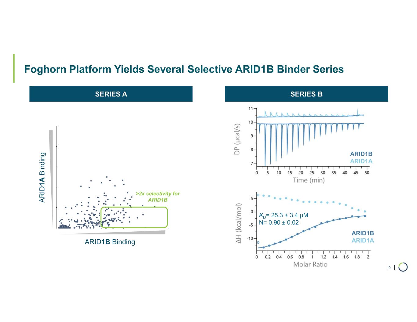 | Foghorn Platform Yields Several Selective ARID1B Binder Series 19 ARID1B ARID1A KD= 25.3 ± 3.4 µM N= 0.90 ± 0.02 ARID1B ARID1A >2x selectivity for ARID1B ARID1B Binding A R ID 1A B in di ng SERIES A SERIES B