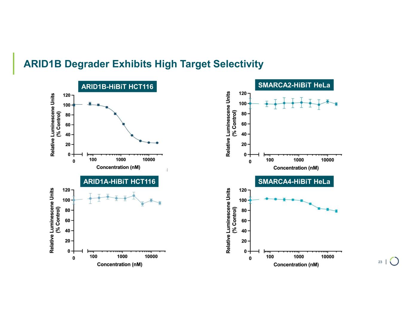 | ARID1B Degrader Exhibits High Target Selectivity 23 ARID1B-HiBiT HCT116 ARID1A-HiBiT HCT116 SMARCA2-HiBiT HeLa SMARCA4-HiBiT HeLa