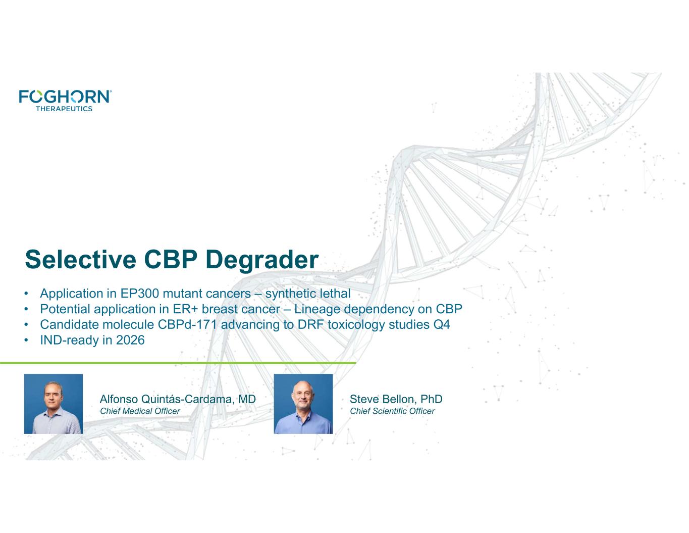 Alfonso Quintás-Cardama, MD Chief Medical Officer Selective CBP Degrader • Application in EP300 mutant cancers – synthetic lethal • Potential application in ER+ breast cancer – Lineage dependency on CBP • Candidate molecule CBPd-171 advancing to DRF toxicology studies Q4 • IND-ready in 2026 Steve Bellon, PhD Chief Scientific Officer