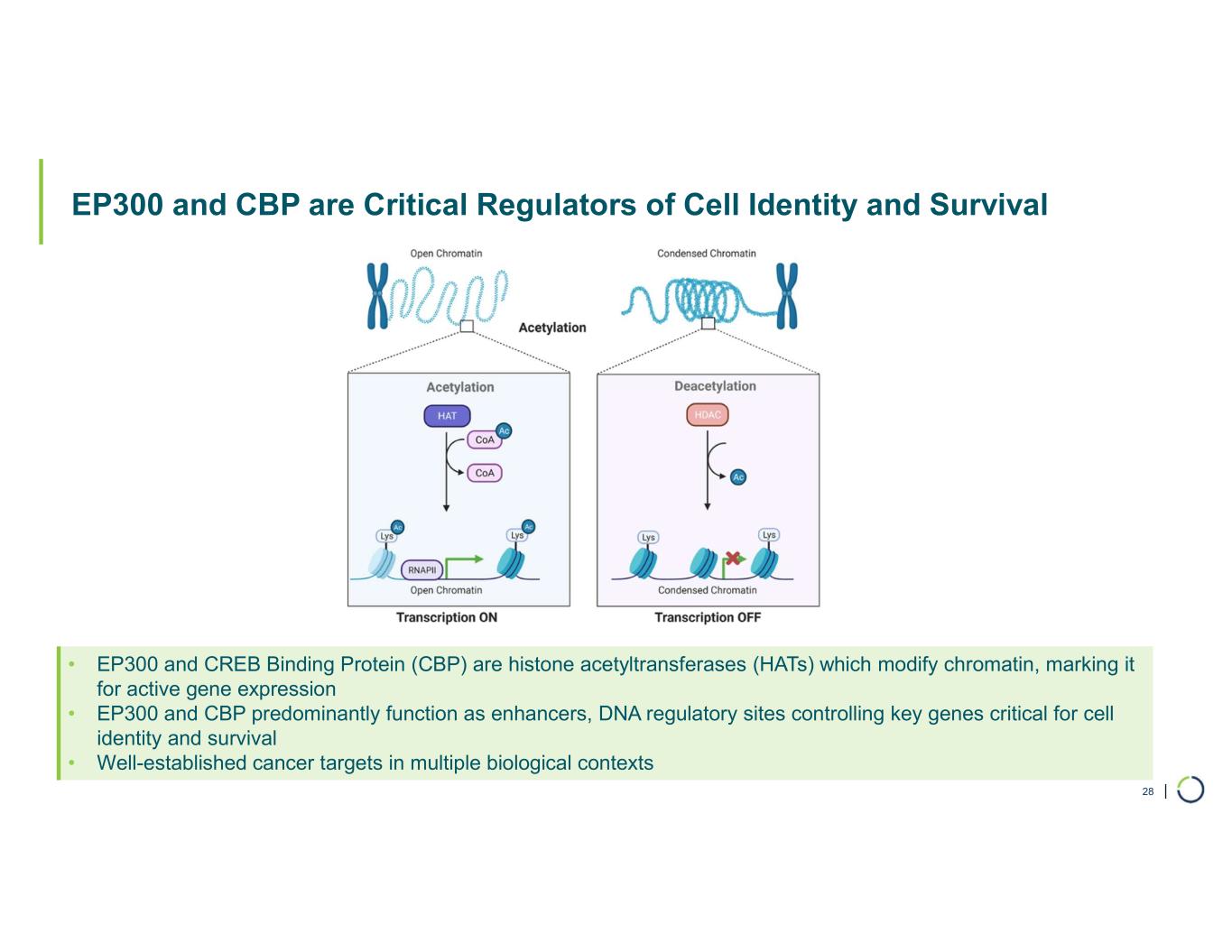 | EP300 and CBP are Critical Regulators of Cell Identity and Survival 28 • EP300 and CREB Binding Protein (CBP) are histone acetyltransferases (HATs) which modify chromatin, marking it for active gene expression • EP300 and CBP predominantly function as enhancers, DNA regulatory sites controlling key genes critical for cell identity and survival • Well-established cancer targets in multiple biological contexts