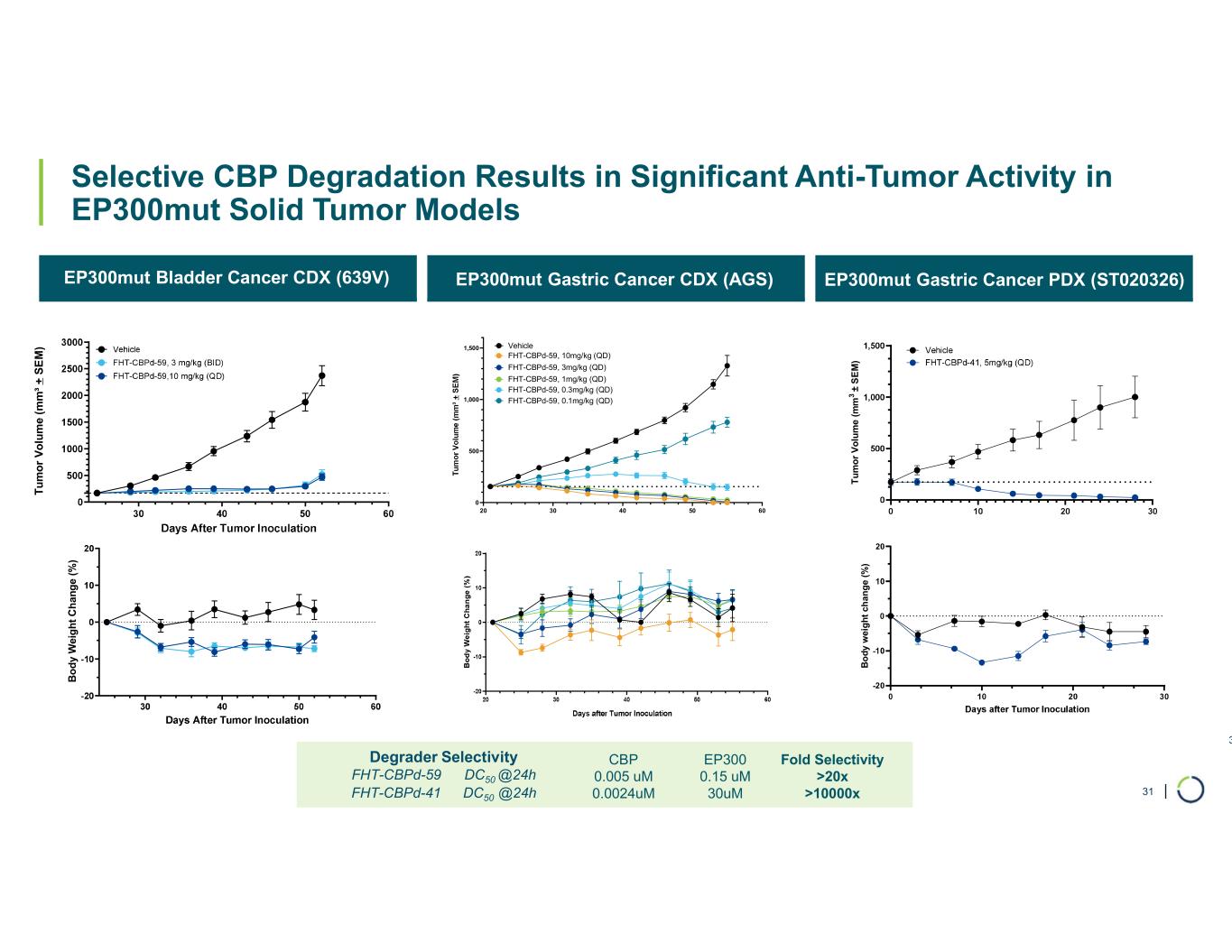 | Potential for Significant Impact to Patients with a Selective CBP Degrader 30 CBP Dependent CancersTUMORS WITH EP300 MUTATIONS ER+ Breast CancerOther (gastric2, CRC, NSCLC) Bladder Gynecological (endometrial, cervical, ovarian) 210K349K84K105KUS Incidence1 NA6%10%8% Mutation frequency NA21K8.4K8.4K US Incidence (2025) of EP300 mutated tumors EP300 mutations are prevalent in multiple tumor types 1. 2025 US incidence from Clarivate 2. Adenocarcinoma CRC: Colorectal Cancer; NSCLC: Non-small Cell Lung Cancer