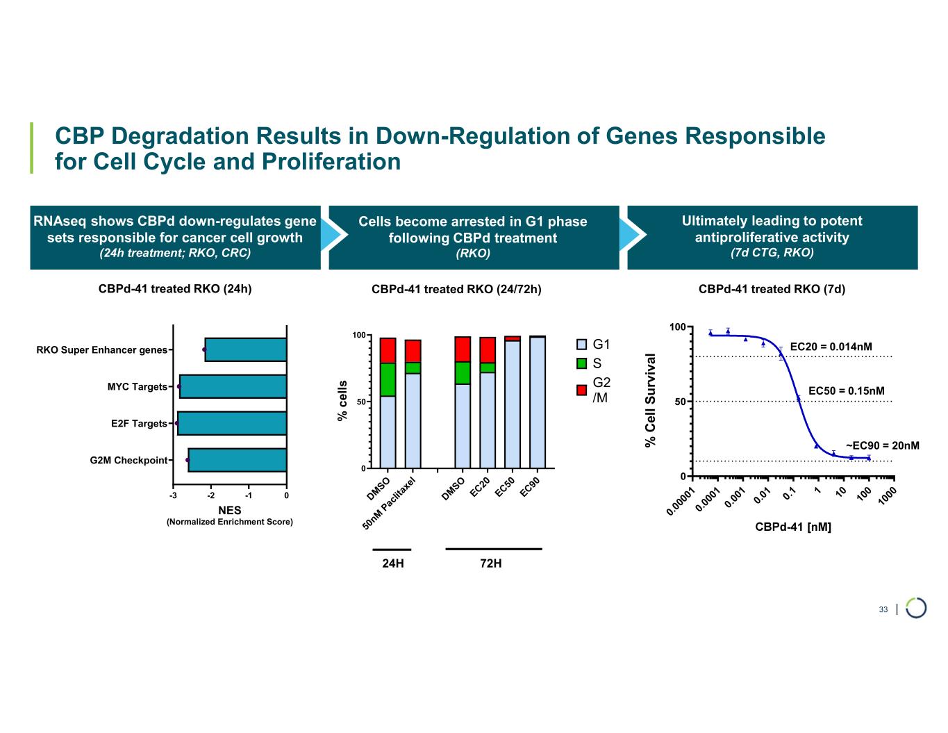| CBP Degradation Results in Down-Regulation of Genes Responsible for Cell Cycle and Proliferation CBP RNAseq shows CBPd down-regulates gene sets responsible for cancer cell growth (24h treatment; RKO, CRC) Cells become arrested in G1 phase following CBPd treatment (RKO) Ultimately leading to potent antiproliferative activity (7d CTG, RKO) 33 -3 -2 -1 0 G2M Checkpoint E2F Targets MYC Targets RKO Super Enhancer genes NES (Normalized Enrichment Score) DM SO 50 nM P ac lit ax el DM SO EC20 EC50 EC90 0 50 100 % c el ls G1 S G2 /M 0. 00 00 1 0. 00 01 0. 00 1 0. 01 0. 1 1 10 10 0 10 00 % C el l S u rv iv al EC20 = 0.014nM EC50 = 0.15nM ~EC90 = 20nM CBPd-41 treated RKO (24h) CBPd-41 treated RKO (24/72h) 24H 72H CBPd-41 treated RKO (7d)