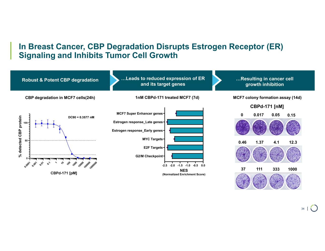 | In Breast Cancer, CBP Degradation Disrupts Estrogen Receptor (ER) Signaling and Inhibits Tumor Cell Growth CBP Robust & Potent CBP degradation …Resulting in cancer cell growth inhibition 34 0. 00 01 0. 00 1 0. 01 0. 1 1 10 10 0 10 00 10 00 0 10 00 00 10 00 00 0 % d e te c te d C B P p ro te in CBP degradation in MCF7 cells(24h) …Leads to reduced expression of ER and its target genes MCF7 colony formation assay (14d) 33311137 12.34.11.370.46 0.150.050.017 1000 0 CBPd-171 [nM] -2.5 -2.0 -1.5 -1.0 -0.5 0.0 G2/M Checkpoint E2F Targets MYC Targets Estrogen response_Early genes Estrogen response_Late genes MCF7 Super Enhancer genes NES (Normalized Enrichment Score) 1nM CBPd-171 treated MCF7 (7d)