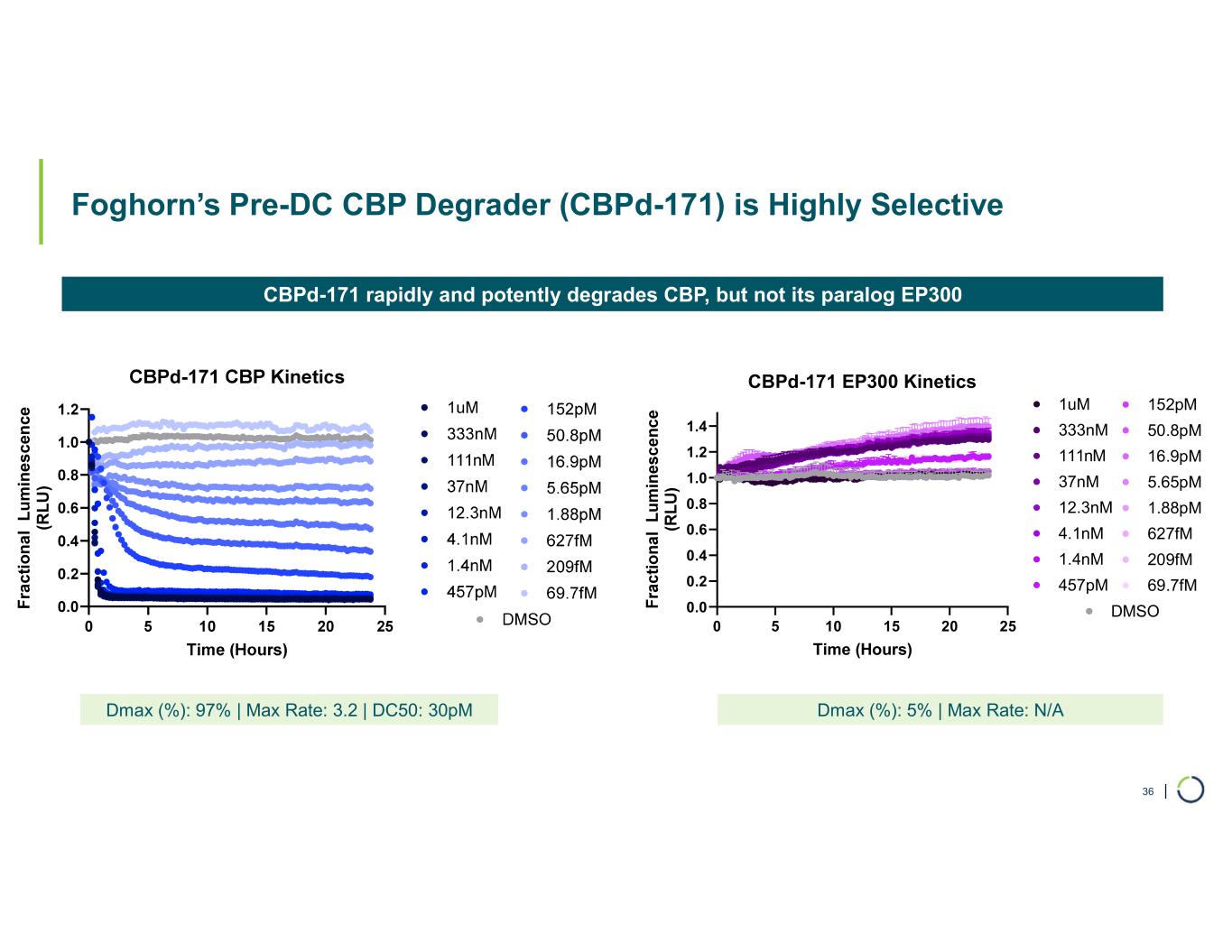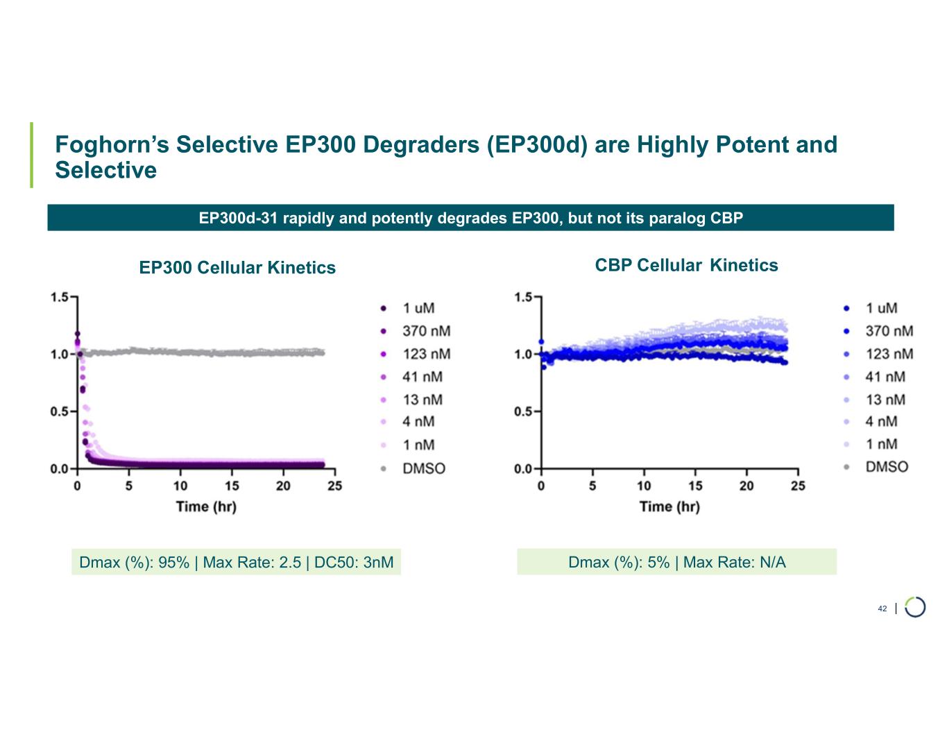 | Foghorn’s Selective EP300 Degraders (EP300d) are Highly Potent and Selective 42 Dmax (%): 95% | Max Rate: 2.5 | DC50: 3nM Dmax (%): 5% | Max Rate: N/A EP300 Cellular Kinetics CBP Cellular Kinetics EP300d-31 rapidly and potently degrades EP300, but not its paralog CBP
