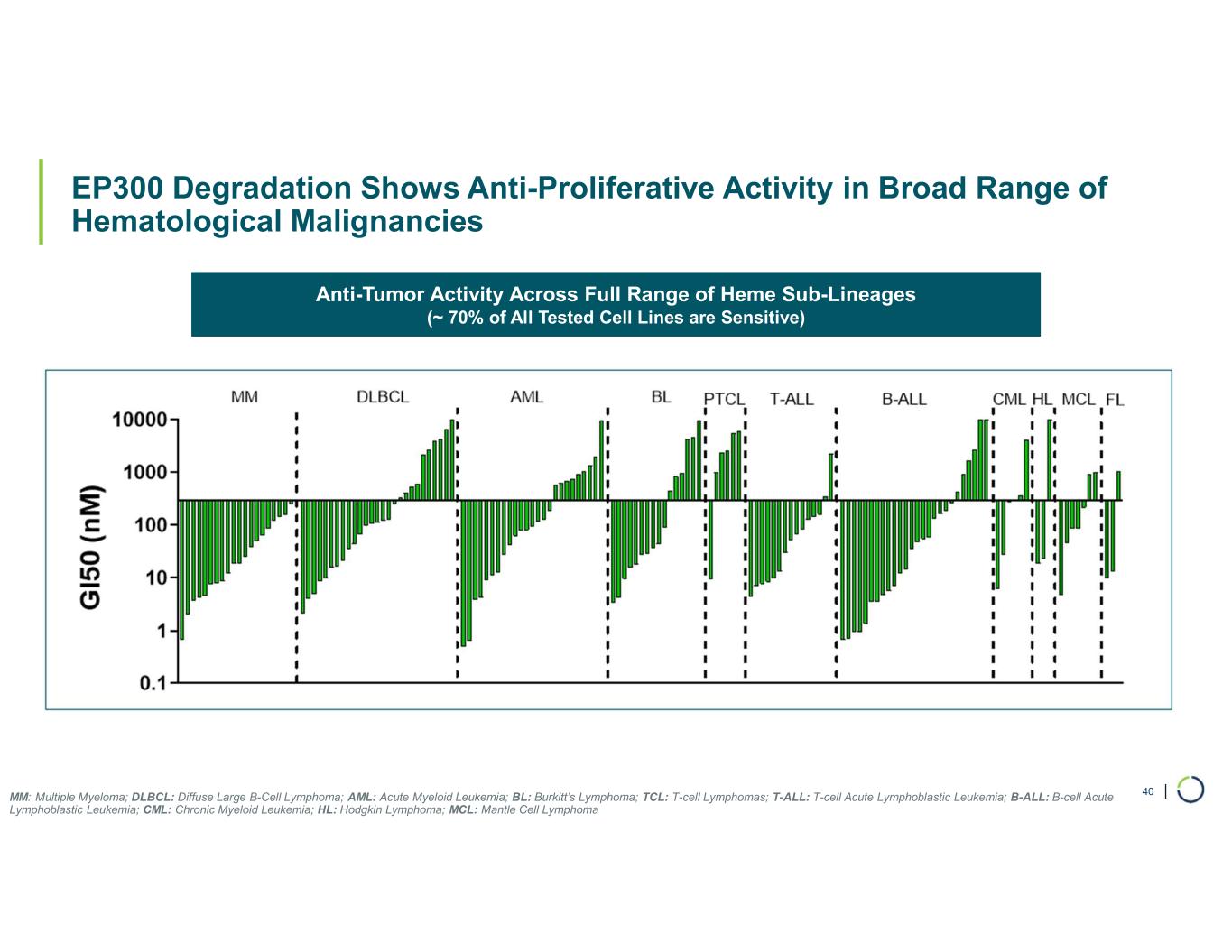 | EP300 Degradation Shows Anti-Proliferative Activity in Broad Range of Hematological Malignancies 40MM: Multiple Myeloma; DLBCL: Diffuse Large B-Cell Lymphoma; AML: Acute Myeloid Leukemia; BL: Burkitt’s Lymphoma; TCL: T-cell Lymphomas; T-ALL: T-cell Acute Lymphoblastic Leukemia; B-ALL: B-cell Acute Lymphoblastic Leukemia; CML: Chronic Myeloid Leukemia; HL: Hodgkin Lymphoma; MCL: Mantle Cell Lymphoma Anti-Tumor Activity Across Full Range of Heme Sub-Lineages (~ 70% of All Tested Cell Lines are Sensitive)
