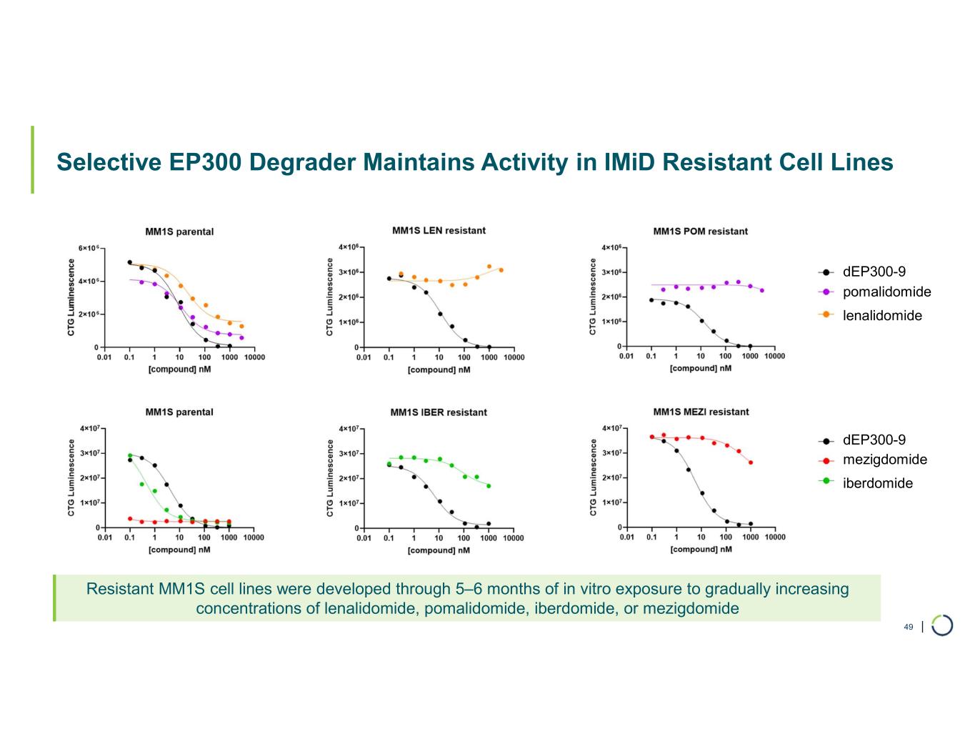 | Cereblon Based EP300 Degrader is Potent on Parental MM Cell Line, but Ineffective Against IMiD Resistant Cell Lines 48 dEP300-9 VHL-based EP300 degrader dEP300-6 CRBN-based EP300 degrader MM1S parental MM1S mezigdomide resistant MM1S iberdomide resistant Iberdomide Mezigdomide