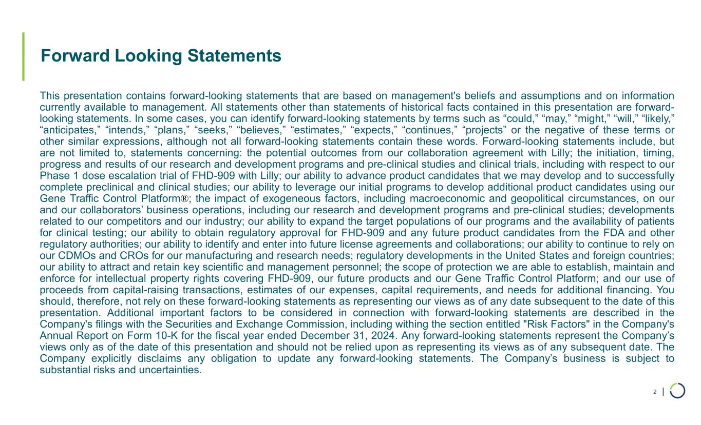 | Forward Looking Statements 2 This presentation contains forward-looking statements that are based on management's beliefs and assumptions and on information currently available to management. All statements other than statements of historical facts contained in this presentation are forward- looking statements. In some cases, you can identify forward-looking statements by terms such as “could,” “may,” “might,” “will,” “likely,” “anticipates,” “intends,” “plans,” “seeks,” “believes,” “estimates,” “expects,” “continues,” “projects” or the negative of these terms or other similar expressions, although not all forward-looking statements contain these words. Forward-looking statements include, but are not limited to, statements concerning: the potential outcomes from our collaboration agreement with Lilly; the initiation, timing, progress and results of our research and development programs and pre-clinical studies and clinical trials, including with respect to our Phase 1 dose escalation trial of FHD-909 with Lilly; our ability to advance product candidates that we may develop and to successfully complete preclinical and clinical studies; our ability to leverage our initial programs to develop additional product candidates using our Gene Traffic Control Platform®; the impact of exogeneous factors, including macroeconomic and geopolitical circumstances, on our and our collaborators’ business operations, including our research and development programs and pre-clinical studies; developments related to our competitors and our industry; our ability to expand the target populations of our programs and the availability of patients for clinical testing; our ability to obtain regulatory approval for FHD-909 and any future product candidates from the FDA and other regulatory authorities; our ability to identify and enter into future license agreements and collaborations; our ability to continue to rely on our CDMOs and CROs for our manufacturing and research needs; regulatory developments in the United States and foreign countries; our ability to attract and retain key scientific and management personnel; the scope of protection we are able to establish, maintain and enforce for intellectual property rights covering FHD-909, our future products and our Gene Traffic Control Platform; and our use of proceeds from capital-raising transactions, estimates of our expenses, capital requirements, and needs for additional financing. You should, therefore, not rely on these forward-looking statements as representing our views as of any date subsequent to the date of this presentation. Additional important factors to be considered in connection with forward-looking statements are described in the Company's filings with the Securities and Exchange Commission, including withing the section entitled "Risk Factors" in the Company's Annual Report on Form 10-K for the fiscal year ended December 31, 2024. Any forward-looking statements represent the Company’s views only as of the date of this presentation and should not be relied upon as representing its views as of any subsequent date. The Company explicitly disclaims any obligation to update any forward-looking statements. The Company’s business is subject to substantial risks and uncertainties.