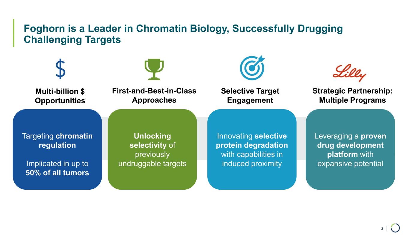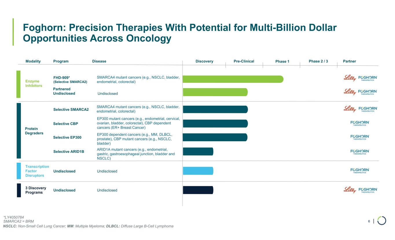 | Foghorn: Precision Therapies With Potential for Multi-Billion Dollar Opportunities Across Oncology 6 Modality Program Phase 1 Enzyme Inhibitors Transcription Factor Disruptors Undisclosed Protein Degraders Partner FHD-909* (Selective SMARCA2) 3 Discovery Programs Undisclosed Partnered Undisclosed Disease SMARCA4 mutant cancers (e.g., NSCLC, bladder, endometrial, colorectal) Selective SMARCA2 SMARCA4 mutant cancers (e.g., NSCLC, bladder, endometrial, colorectal) Selective ARID1B ARID1A mutant cancers (e.g., endometrial, gastric, gastroesophageal junction, bladder and NSCLC) Selective CBP EP300 mutant cancers (e.g., endometrial, cervical, ovarian, bladder, colorectal), CBP dependent cancers (ER+ Breast Cancer) Selective EP300 EP300 dependent cancers (e.g., MM, DLBCL, prostate), CBP mutant cancers (e.g., NSCLC, bladder) Undisclosed Undisclosed Undisclosed Pre-Clinical Phase 2 / 3Discovery *LY4050784 SMARCA2 = BRM NSCLC: Non-Small Cell Lung Cancer; MM: Multiple Myeloma; DLBCL: Diffuse Large B-Cell Lymphoma