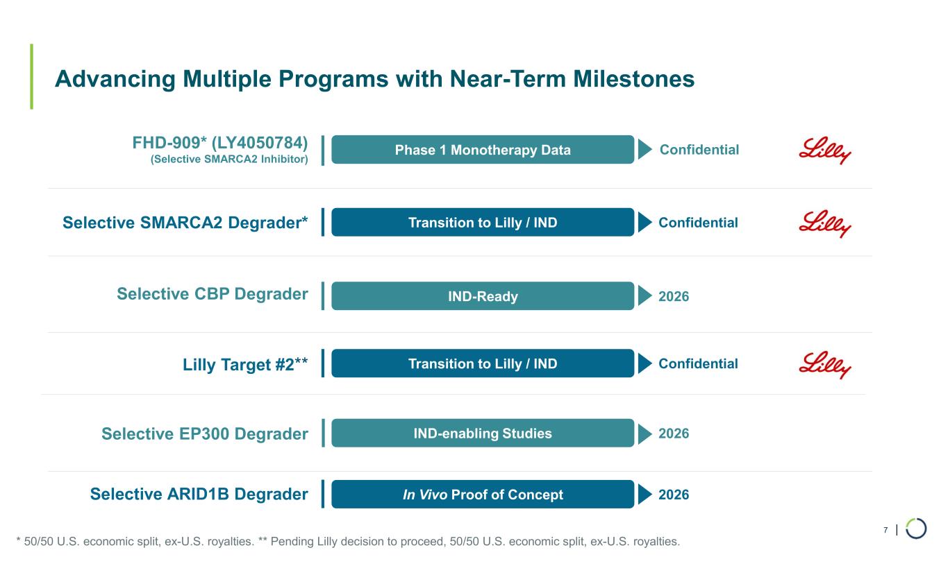 | Advancing Multiple Programs with Near-Term Milestones 7 Phase 1 Monotherapy DataFHD-909* (LY4050784) (Selective SMARCA2 Inhibitor) 2026IND-Ready Selective CBP Degrader 2026IND-enabling StudiesSelective EP300 Degrader ConfidentialTransition to Lilly / INDSelective SMARCA2 Degrader* ConfidentialTransition to Lilly / INDLilly Target #2** 2026In Vivo Proof of ConceptSelective ARID1B Degrader * 50/50 U.S. economic split, ex-U.S. royalties. ** Pending Lilly decision to proceed, 50/50 U.S. economic split, ex-U.S. royalties. Confidential