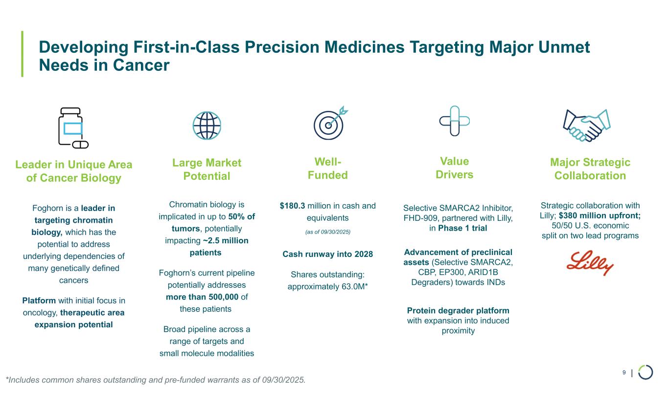 | FHD-909 is Being Developed in Collaboration with Lilly; Landmark Agreement Signed in December 2021 Significant Upfront and Economics Strong Momentum and Shared Vision Ongoing Discovery Programs • $300 million cash • $80 million in Foghorn common stock at a price of $20 per share • 50/50 U.S. economic split on SMARCA2- target and another undisclosed program • Tiered ex-U.S. royalties ranging from low double-digit into 20s • Lilly is a leading oncology company with a track record of innovation and execution • Lilly selected FHD-909 for development and initiated the first clinical trial in 2024 • Thorough evaluation of FHD-909 in models of SMARCA2-dependent tumors • Three additional programs as part of collaboration (undisclosed) • Potential to earn royalties and up to $1.3 billion in potential milestones across these three programs 8