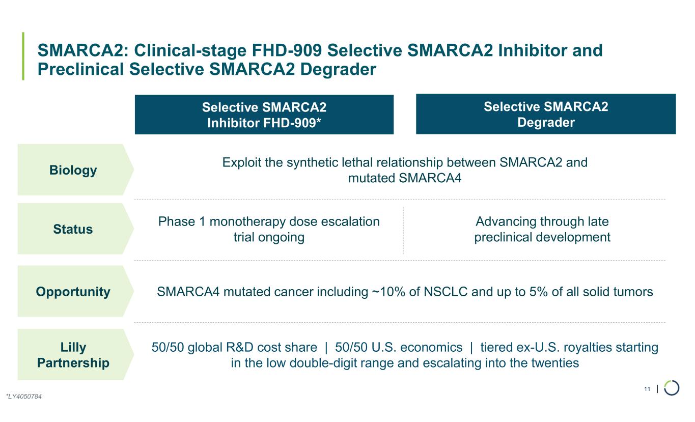 | SMARCA2: Clinical-stage FHD-909 Selective SMARCA2 Inhibitor and Preclinical Selective SMARCA2 Degrader 11 Selective SMARCA2 Inhibitor FHD-909* Selective SMARCA2 Degrader Biology Exploit the synthetic lethal relationship between SMARCA2 and mutated SMARCA4 Status Phase 1 monotherapy dose escalation trial ongoing Advancing through late preclinical development Opportunity SMARCA4 mutated cancer including ~10% of NSCLC and up to 5% of all solid tumors Lilly Partnership 50/50 global R&D cost share | 50/50 U.S. economics | tiered ex-U.S. royalties starting in the low double-digit range and escalating into the twenties *LY4050784