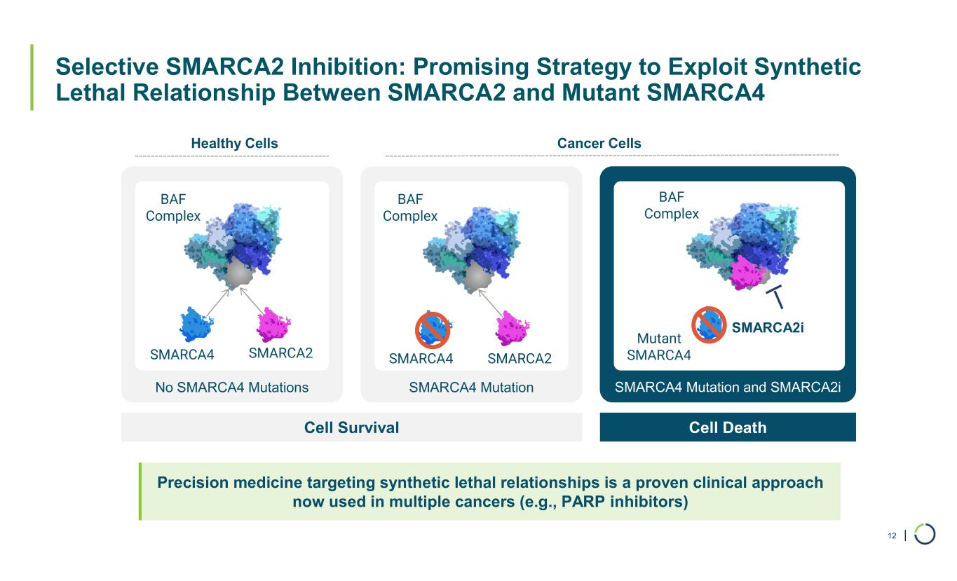 | Selective SMARCA2 Inhibition: Promising Strategy to Exploit Synthetic Lethal Relationship Between SMARCA2 and Mutant SMARCA4 12 No SMARCA4 Mutations SMARCA4 Mutation SMARCA4 Mutation and SMARCA2i Cell Survival Cell Death Healthy Cells Cancer Cells SMARCA4 SMARCA2 BAF Complex BAF Complex Mutant SMARCA4 BAF Complex SMARCA2i Precision medicine targeting synthetic lethal relationships is a proven clinical approach now used in multiple cancers (e.g., PARP inhibitors) SMARCA4 SMARCA2