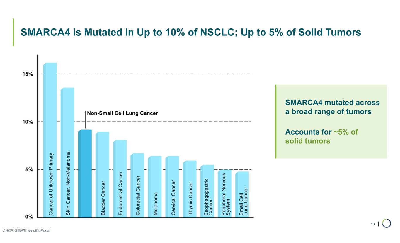 | SMARCA4 is Mutated in Up to 10% of NSCLC; Up to 5% of Solid Tumors 13 SMARCA4 mutated across a broad range of tumors Accounts for ~5% of solid tumors AACR GENIE via cBioPortal