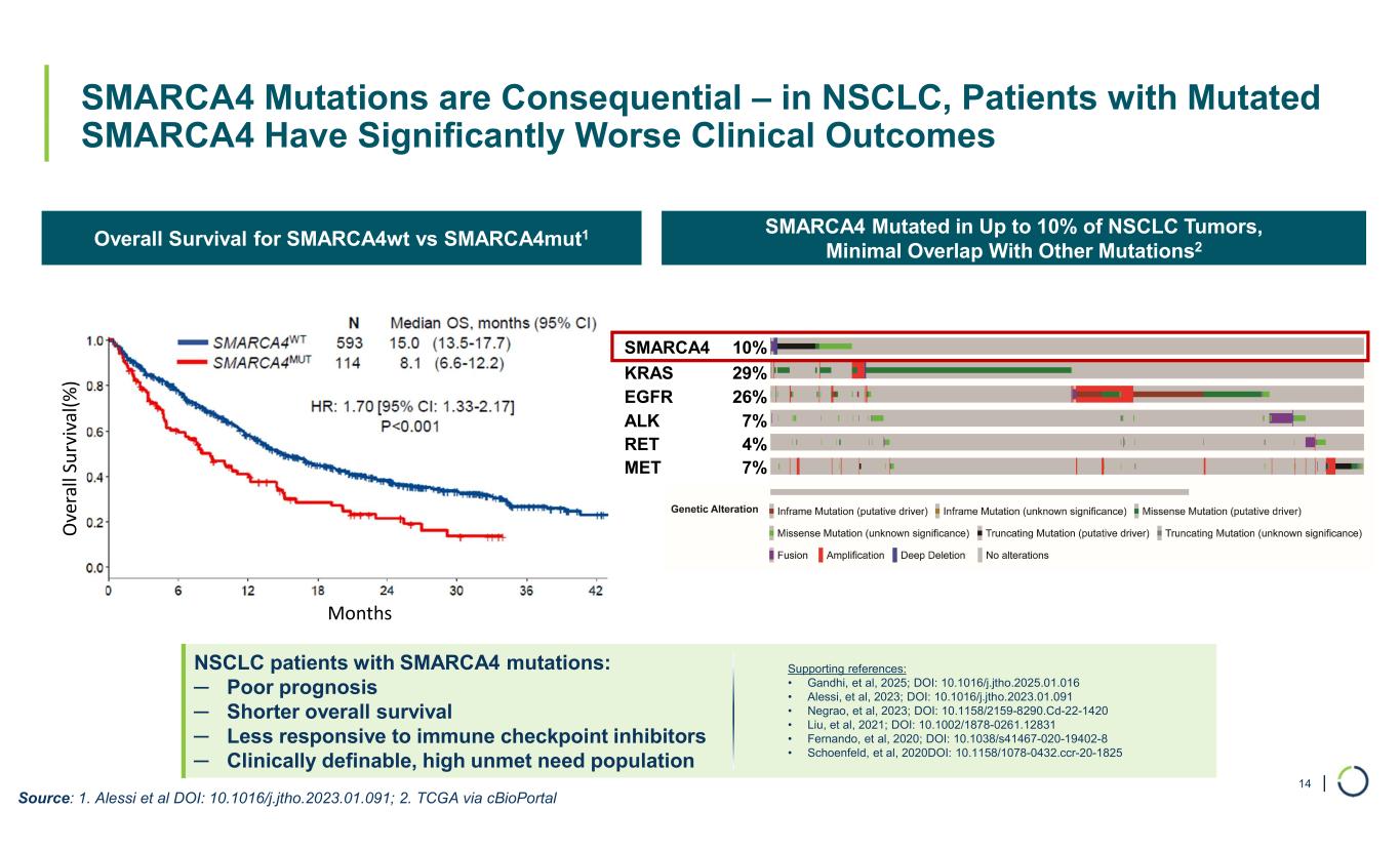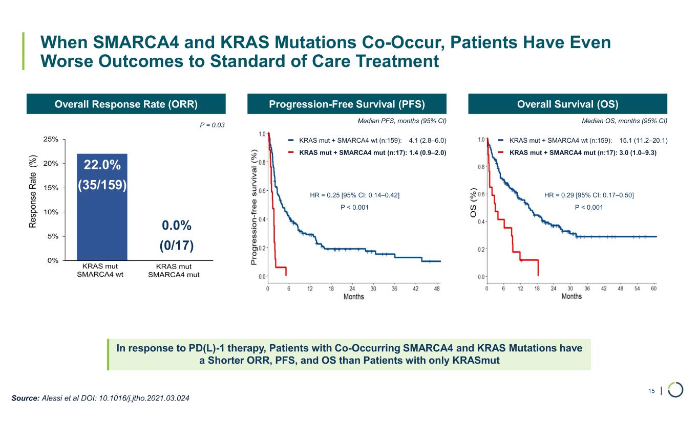 | NSCLC patients with SMARCA4 mutations: ─ Poor prognosis ─ Shorter overall survival ─ Less responsive to immune checkpoint inhibitors ─ Clinically definable, high unmet need population SMARCA4 Mutated in Up to 10% of NSCLC Tumors, Minimal Overlap With Other Mutations2Overall Survival for SMARCA4wt vs SMARCA4mut1 SMARCA4 Mutations are Consequential – in NSCLC, Patients with Mutated SMARCA4 Have Significantly Worse Clinical Outcomes 14 SMARCA4 10% KRAS 29% EGFR 26% ALK 7% RET 4% MET 7% Source: 1. Alessi et al DOI: 10.1016/j.jtho.2023.01.091; 2. TCGA via cBioPortal O ve ra ll Su rv iv al (% ) Months Supporting references: • Gandhi, et al, 2025; DOI: 10.1016/j.jtho.2025.01.016 • Alessi, et al, 2023; DOI: 10.1016/j.jtho.2023.01.091 • Negrao, et al, 2023; DOI: 10.1158/2159-8290.Cd-22-1420 • Liu, et al, 2021; DOI: 10.1002/1878-0261.12831 • Fernando, et al, 2020; DOI: 10.1038/s41467-020-19402-8 • Schoenfeld, et al, 2020DOI: 10.1158/1078-0432.ccr-20-1825