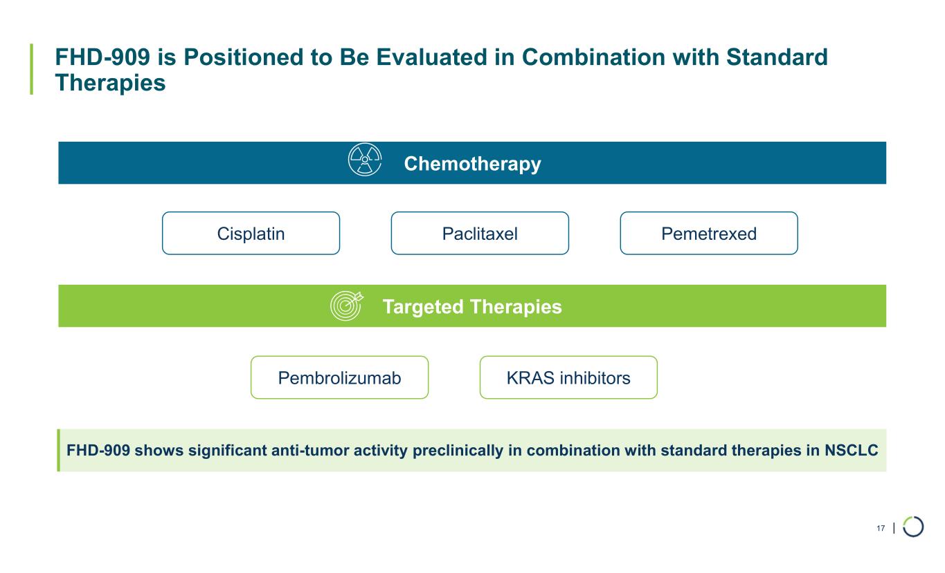 | Chemotherapy Targeted Therapies FHD-909 is Positioned to Be Evaluated in Combination with Standard Therapies FHD-909 shows significant anti-tumor activity preclinically in combination with standard therapies in NSCLC 17 Cisplatin PemetrexedPaclitaxel KRAS inhibitorsPembrolizumab