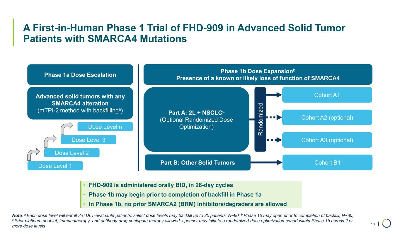 | A First-in-Human Phase 1 Trial of FHD-909 in Advanced Solid Tumor Patients with SMARCA4 Mutations Phase 1a Dose Escalation Advanced solid tumors with any SMARCA4 alteration (mTPI-2 method with backfillinga) Dose Level 1 Dose Level 2 Dose Level 3 Dose Level n Phase 1b Dose Expansionb Presence of a known or likely loss of function of SMARCA4 Part A: 2L + NSCLCc (Optional Randomized Dose Optimization) Part B: Other Solid Tumors Cohort A1 Cohort A2 (optional) Cohort A3 (optional) R a nd om iz ed Cohort B1 • FHD-909 is administered orally BID, in 28-day cycles • Phase 1b may begin prior to completion of backfill in Phase 1a • In Phase 1b, no prior SMARCA2 (BRM) inhibitors/degraders are allowed Note: a Each dose level will enroll 3-6 DLT-evaluable patients; select dose levels may backfill up to 20 patients; N~80; b Phase 1b may open prior to completion of backfill; N~80; c Prior platinum doublet, immunotherapy, and antibody-drug conjugate therapy allowed; sponsor may initiate a randomized dose optimization cohort within Phase 1b across 2 or more dose levels 18