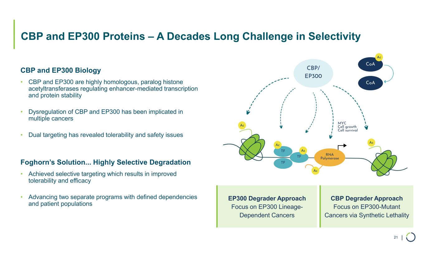| Developing a Portfolio of Novel and Selective Degraders 20 Selective ARID1B Degrader Selective CBP Degrader • Mutated in up to 5% of all solid tumors • First to demonstrate robust and selective degradation of the protein • Developing VHL and cereblon degraders, potential for oral delivery • Program advancing towards in vivo proof-of-concept in 2026 • EP300 Mutant and CBP Dependent Cancers • Anti-tumor activity demonstrated including promising potential in ER+ breast cancer. • Long Acting Injectable (LAI) formulation • No significant preclinical heme toxicity • CBPd-171 in DRF studies in Q4 2025; IND-ready in 2026 • CBP Mutant and EP300 Dependent Cancers • Potential across range of heme malignancies, including MM and DLBCL • Highly selective and potent • No significant preclinical heme toxicity • IND-enabling studies in 2026 Selective EP300 Degrader