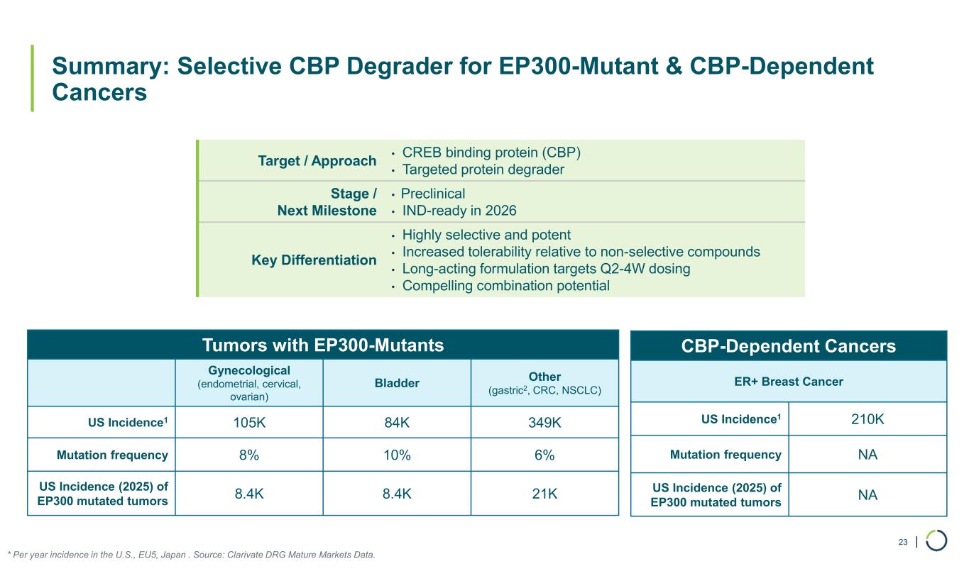 | Summary: Selective CBP Degrader for EP300-Mutant & CBP-Dependent Cancers 23 * Per year incidence in the U.S., EU5, Japan . Source: Clarivate DRG Mature Markets Data. • CREB binding protein (CBP) • Targeted protein degrader Target / Approach • Preclinical • IND-ready in 2026 Stage / Next Milestone • Highly selective and potent • Increased tolerability relative to non-selective compounds • Long-acting formulation targets Q2-4W dosing • Compelling combination potential Key Differentiation Tumors with EP300-Mutants Other (gastric2, CRC, NSCLC) Bladder Gynecological (endometrial, cervical, ovarian) 349K84K105KUS Incidence1 6%10%8%Mutation frequency 21K8.4K8.4K US Incidence (2025) of EP300 mutated tumors CBP-Dependent Cancers ER+ Breast Cancer 210KUS Incidence1 NAMutation frequency NA US Incidence (2025) of EP300 mutated tumors