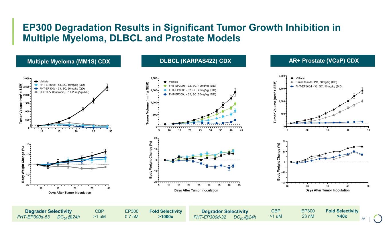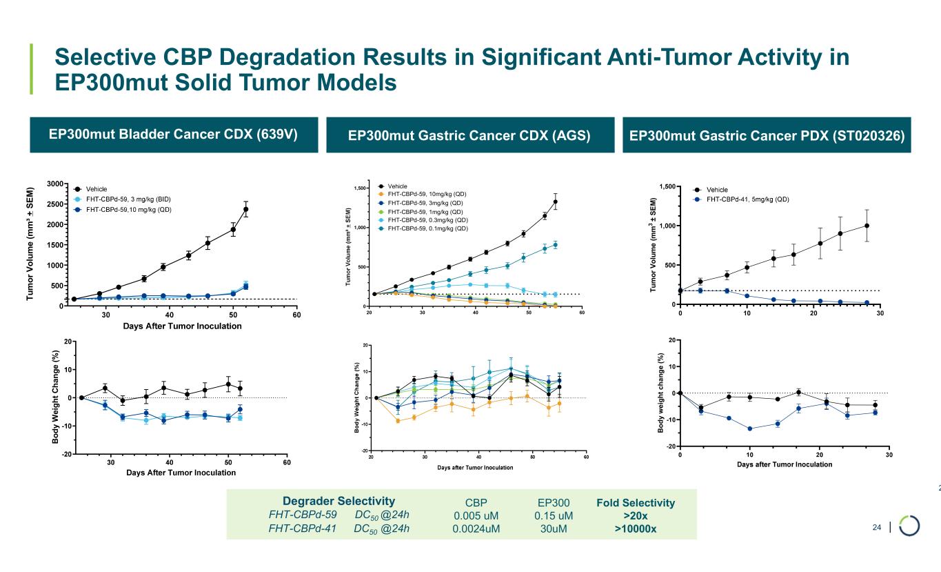 | Selective CBP Degradation Results in Significant Anti-Tumor Activity in EP300mut Solid Tumor Models 24 EP300mut Bladder Cancer CDX (639V) EP300mut Gastric Cancer CDX (AGS) EP300mut Gastric Cancer PDX (ST020326) T u m o r V o lu m e (m m ³ + S E M ) B o d y W ei g h t C h an g e ( % ) 20 30 40 50 60 0 500 1,000 1,500 Vehicle FHT-CBPd-59, 10mg/kg (QD) FHT-CBPd-59, 3mg/kg (QD) FHT-CBPd-59, 1mg/kg (QD) FHT-CBPd-59, 0.3mg/kg (QD) FHT-CBPd-59, 0.1mg/kg (QD) T u m o r V o lu m e ( m m 3 ± S E M ) B o d y w e ig h t ch a n g e ( % ) Fold Selectivity >20x >10000x EP300 0.15 uM 30uM CBP 0.005 uM 0.0024uM Degrader Selectivity FHT-CBPd-59 DC50 @24h FHT-CBPd-41 DC50 @24h 24