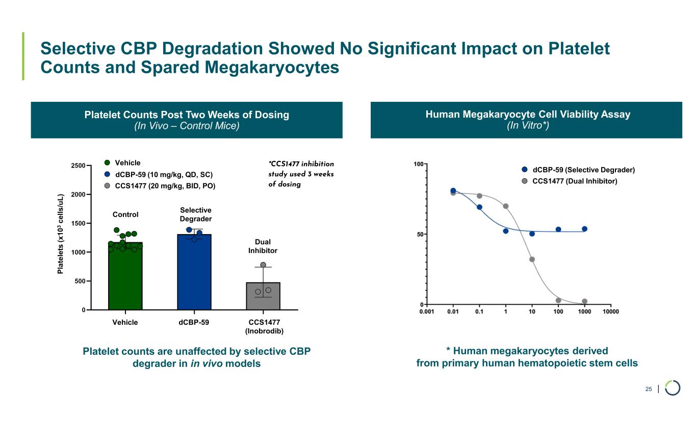 | Selective CBP Degradation Showed No Significant Impact on Platelet Counts and Spared Megakaryocytes 25 Platelet Counts Post Two Weeks of Dosing (In Vivo – Control Mice) Human Megakaryocyte Cell Viability Assay (In Vitro*) dCBP-59 CCS1477 (Inobrodib) Vehicle dCBP-59 (10 mg/kg, QD, SC) Vehicle CCS1477 (20 mg/kg, BID, PO) Dual Inhibitor Selective Degrader Control P la te le ts ( x 10 3 c el ls /u L ) *CCS1477 inhibition study used 3 weeks of dosing dCBP-59 (Selective Degrader) CCS1477 (Dual Inhibitor) Platelet counts are unaffected by selective CBP degrader in in vivo models * Human megakaryocytes derived from primary human hematopoietic stem cells