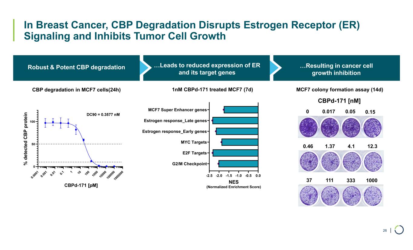 | In Breast Cancer, CBP Degradation Disrupts Estrogen Receptor (ER) Signaling and Inhibits Tumor Cell Growth CBP Robust & Potent CBP degradation …Resulting in cancer cell growth inhibition 26 0. 00 01 0. 00 1 0. 01 0. 1 1 10 10 0 10 00 10 00 0 10 00 00 10 00 00 0 % d e te ct e d C B P p ro te in CBP degradation in MCF7 cells(24h) …Leads to reduced expression of ER and its target genes MCF7 colony formation assay (14d) 33311137 12.34.11.370.46 0.150.050.017 1000 0 CBPd-171 [nM] -2.5 -2.0 -1.5 -1.0 -0.5 0.0 G2/M Checkpoint E2F Targets MYC Targets Estrogen response_Early genes Estrogen response_Late genes MCF7 Super Enhancer genes NES (Normalized Enrichment Score) 1nM CBPd-171 treated MCF7 (7d)