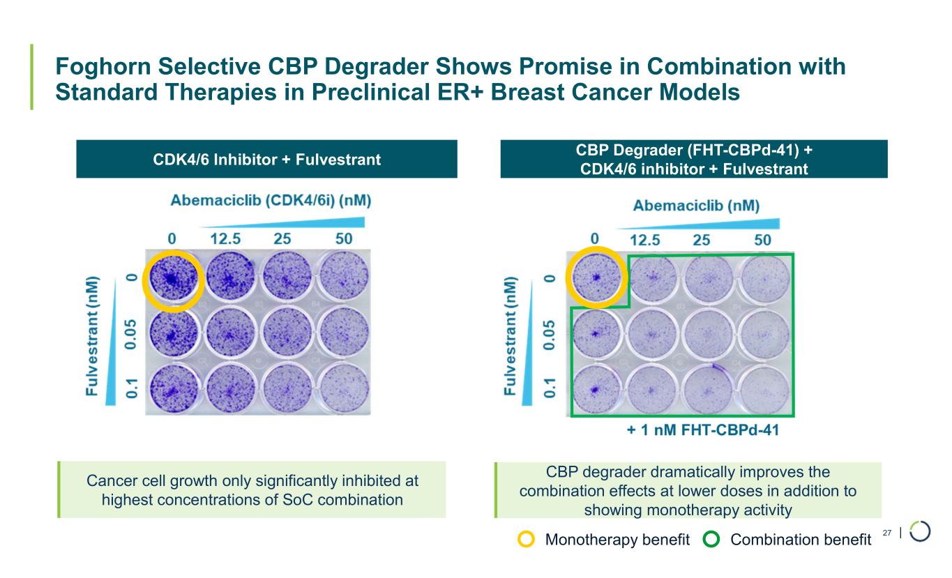 | Foghorn Selective CBP Degrader Shows Promise in Combination with Standard Therapies in Preclinical ER+ Breast Cancer Models 27 CDK4/6 Inhibitor + Fulvestrant CBP Degrader (FHT-CBPd-41) + CDK4/6 inhibitor + Fulvestrant Cancer cell growth only significantly inhibited at highest concentrations of SoC combination CBP degrader dramatically improves the combination effects at lower doses in addition to showing monotherapy activity Monotherapy benefit Combination benefit