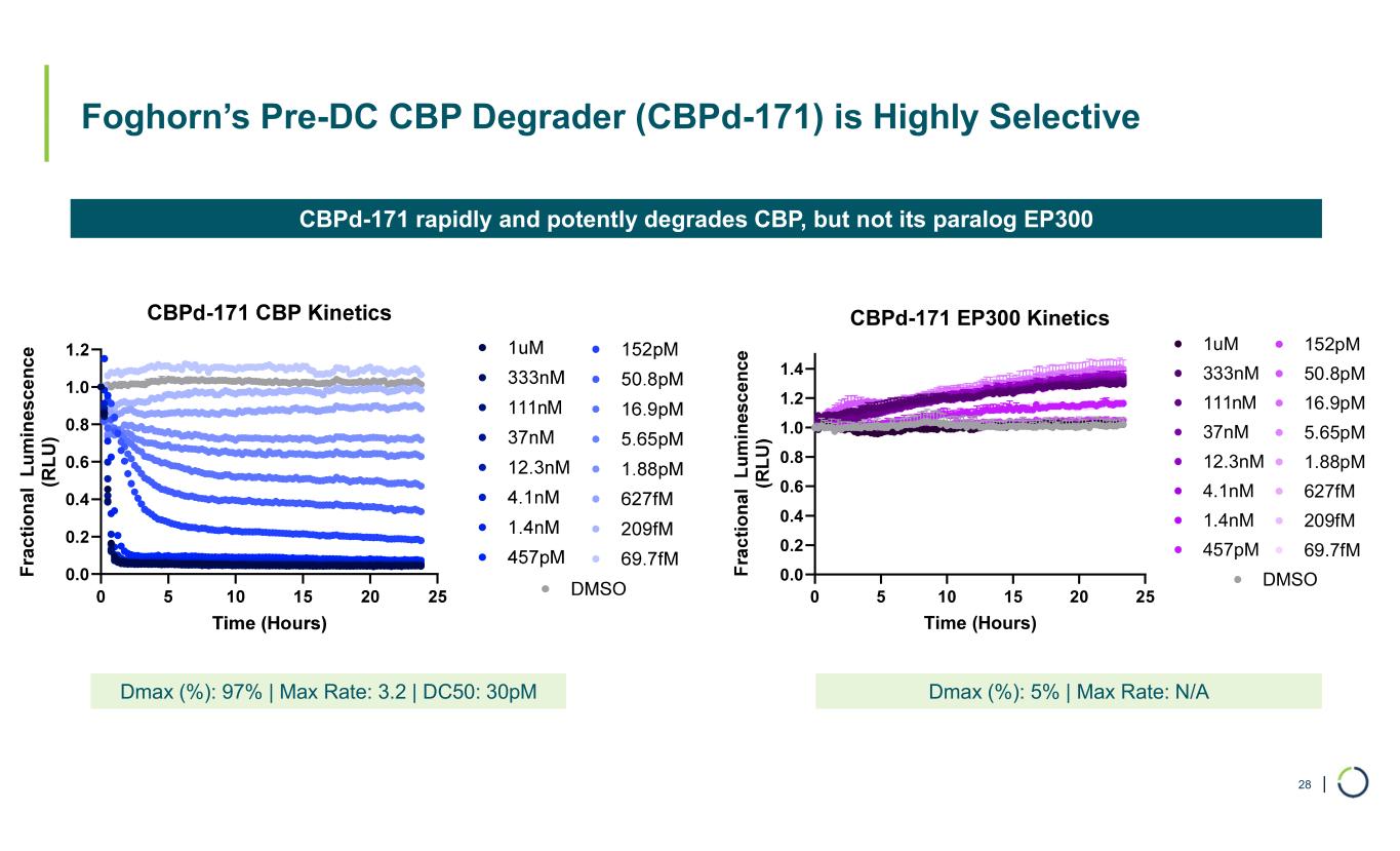 | Foghorn’s Pre-DC CBP Degrader (CBPd-171) is Highly Selective 28 CBPd-171 rapidly and potently degrades CBP, but not its paralog EP300 Dmax (%): 97% | Max Rate: 3.2 | DC50: 30pM Dmax (%): 5% | Max Rate: N/A F ra c ti o n a l L u m in es c e n c e (R L U ) 0 5 10 15 20 25 0.0 0.2 0.4 0.6 0.8 1.0 1.2 1.4 CBPd-171 EP300 Kinetics Time (Hours) DMSO 1uM 333nM 111nM 37nM 12.3nM 4.1nM 1.4nM 457pM 152pM 50.8pM 16.9pM 5.65pM 1.88pM 627fM 209fM 69.7fM
