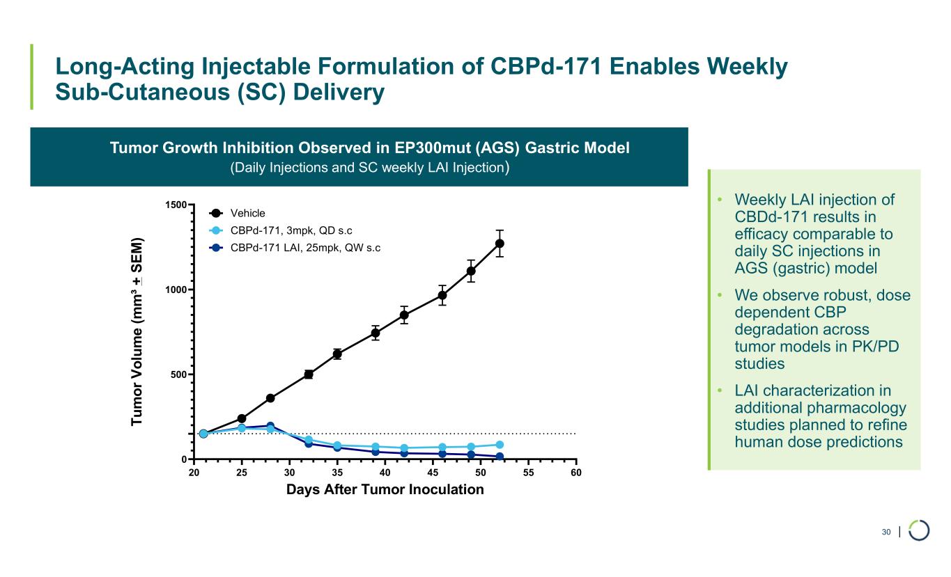 | Long-Acting Injectable Formulation of CBPd-171 Enables Weekly Sub-Cutaneous (SC) Delivery 30 Tumor Growth Inhibition Observed in EP300mut (AGS) Gastric Model (Daily Injections and SC weekly LAI Injection) • Weekly LAI injection of CBDd-171 results in efficacy comparable to daily SC injections in AGS (gastric) model • We observe robust, dose dependent CBP degradation across tumor models in PK/PD studies • LAI characterization in additional pharmacology studies planned to refine human dose predictions 20 25 30 35 40 45 50 55 60 0 500 1000 1500 Days After Tumor Inoculation T u m o r V o lu m e ( m m ³ + S E M ) CBPd-171, 3mpk, QD s.c Vehicle CBPd-171 LAI, 25mpk, QW s.c