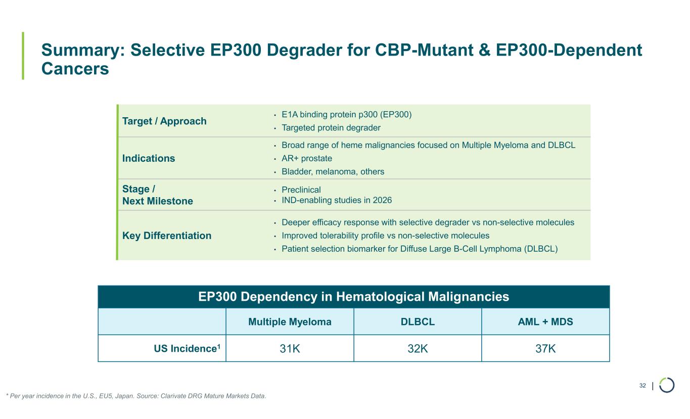 | Summary: Selective EP300 Degrader for CBP-Mutant & EP300-Dependent Cancers 32 * Per year incidence in the U.S., EU5, Japan. Source: Clarivate DRG Mature Markets Data. • E1A binding protein p300 (EP300) • Targeted protein degrader Target / Approach • Broad range of heme malignancies focused on Multiple Myeloma and DLBCL • AR+ prostate • Bladder, melanoma, others Indications • Preclinical • IND-enabling studies in 2026 Stage / Next Milestone • Deeper efficacy response with selective degrader vs non-selective molecules • Improved tolerability profile vs non-selective molecules • Patient selection biomarker for Diffuse Large B-Cell Lymphoma (DLBCL) Key Differentiation EP300 Dependency in Hematological Malignancies AML + MDSDLBCLMultiple Myeloma 37K32K31KUS Incidence1
