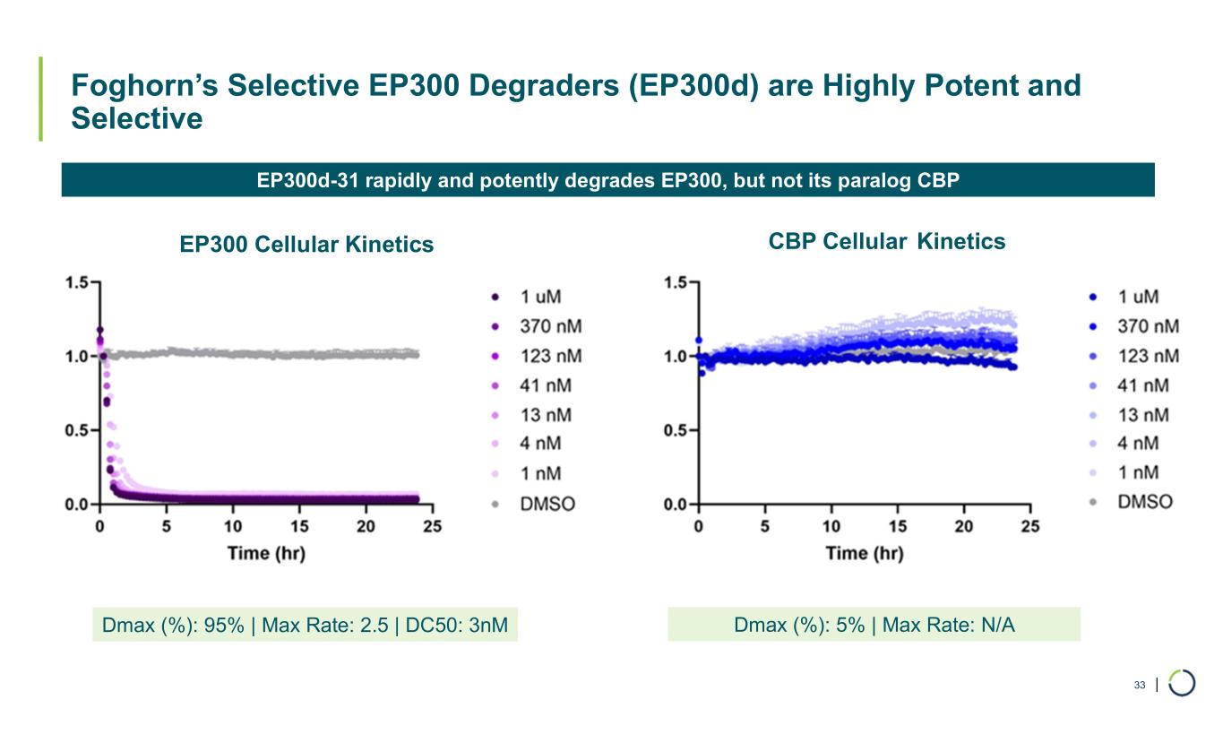 | Foghorn’s Selective EP300 Degraders (EP300d) are Highly Potent and Selective 33 Dmax (%): 95% | Max Rate: 2.5 | DC50: 3nM Dmax (%): 5% | Max Rate: N/A EP300 Cellular Kinetics CBP Cellular Kinetics EP300d-31 rapidly and potently degrades EP300, but not its paralog CBP