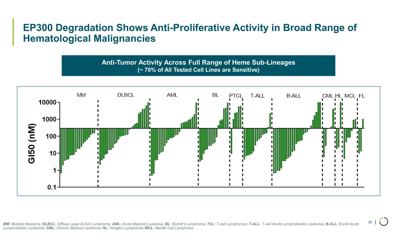 | EP300 Degradation Shows Anti-Proliferative Activity in Broad Range of Hematological Malignancies 35MM: Multiple Myeloma; DLBCL: Diffuse Large B-Cell Lymphoma; AML: Acute Myeloid Leukemia; BL: Burkitt’s Lymphoma; TCL: T-cell Lymphomas; T-ALL: T-cell Acute Lymphoblastic Leukemia; B-ALL: B-cell Acute Lymphoblastic Leukemia; CML: Chronic Myeloid Leukemia; HL: Hodgkin Lymphoma; MCL: Mantle Cell Lymphoma Anti-Tumor Activity Across Full Range of Heme Sub-Lineages (~ 70% of All Tested Cell Lines are Sensitive)