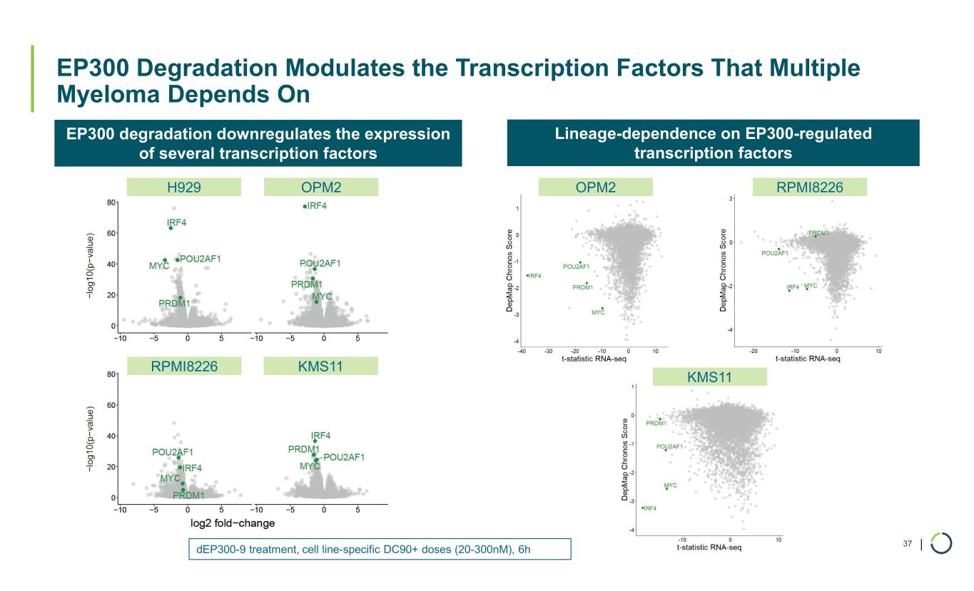 | EP300 Degradation Modulates the Transcription Factors That Multiple Myeloma Depends On 37 EP300 degradation downregulates the expression of several transcription factors H929 OPM2 Lineage-dependence on EP300-regulated transcription factors KMS11RPMI8226 OPM2 RPMI8226 KMS11 dEP300-9 treatment, cell line-specific DC90+ doses (20-300nM), 6h