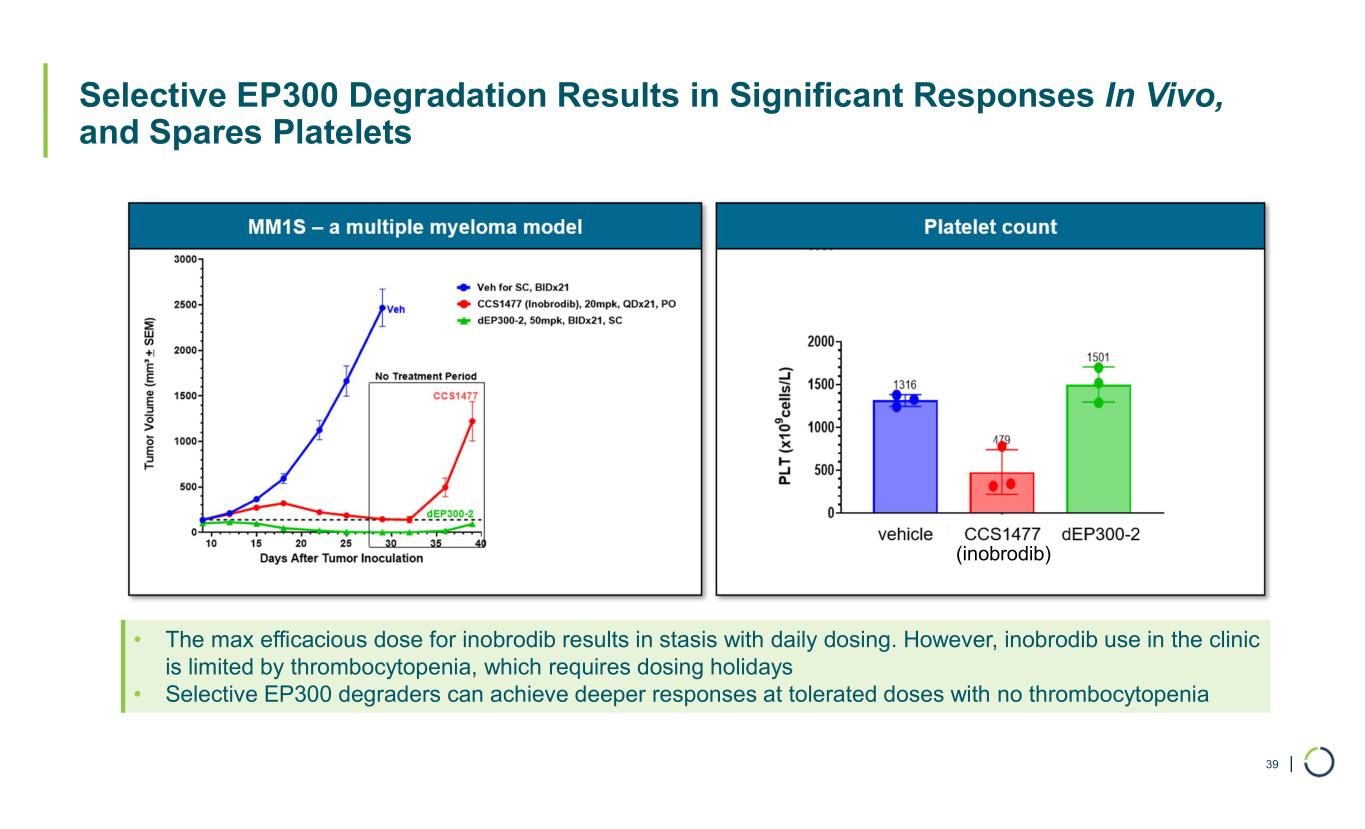 | Selective EP300 Degradation Results in Significant Responses In Vivo, and Spares Platelets 39 • The max efficacious dose for inobrodib results in stasis with daily dosing. However, inobrodib use in the clinic is limited by thrombocytopenia, which requires dosing holidays • Selective EP300 degraders can achieve deeper responses at tolerated doses with no thrombocytopenia (inobrodib)