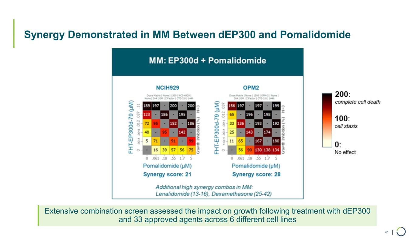 | Synergy Demonstrated in MM Between dEP300 and Pomalidomide 41 Extensive combination screen assessed the impact on growth following treatment with dEP300 and 33 approved agents across 6 different cell lines