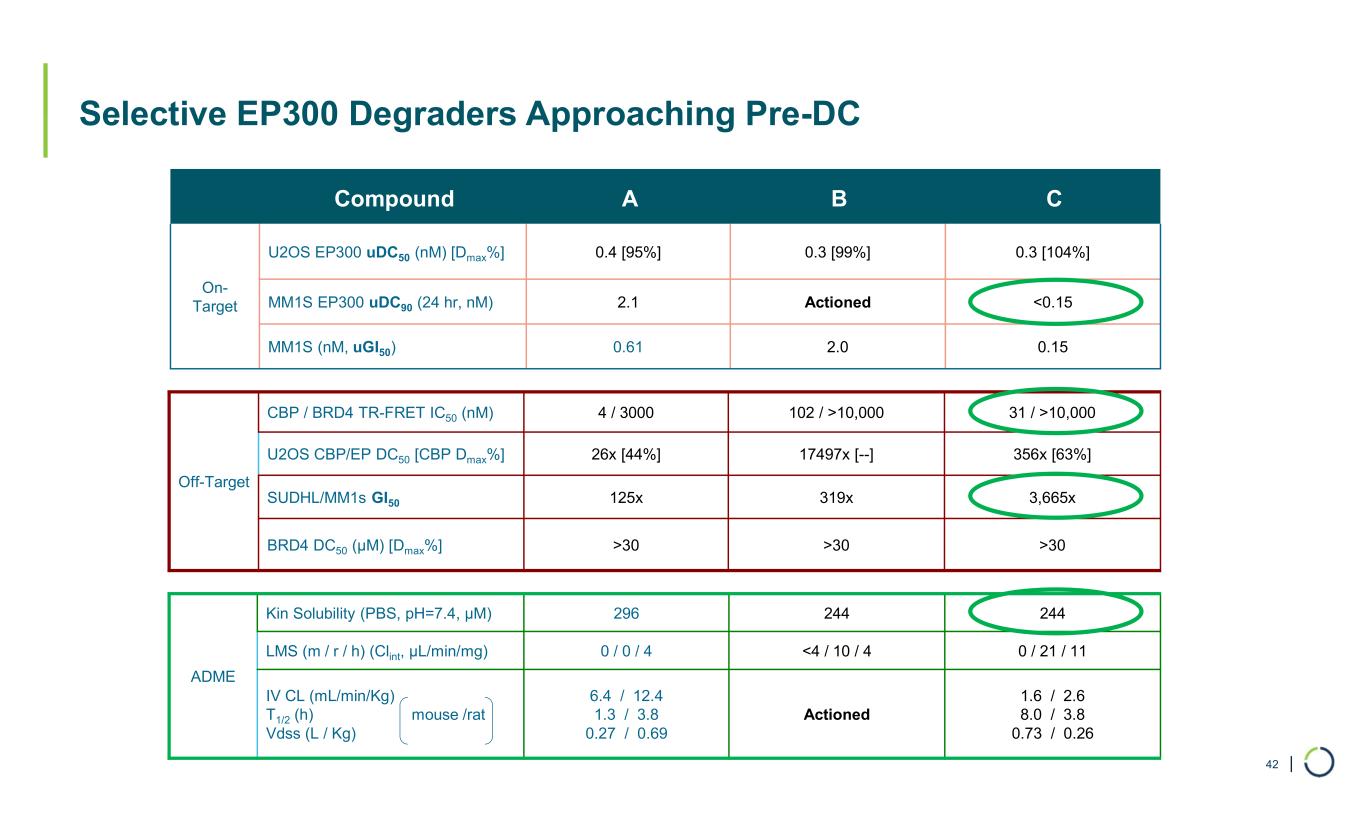 | Selective EP300 Degraders Approaching Pre-DC CBACompound 0.3 [104%]0.3 [99%]0.4 [95%]U2OS EP300 uDC50 (nM) [Dmax%] On- Target <0.15Actioned2.1MM1S EP300 uDC90 (24 hr, nM) 0.152.00.61MM1S (nM, uGI50) 31 / >10,000102 / >10,0004 / 3000CBP / BRD4 TR-FRET IC50 (nM) Off-Target 356x [63%]17497x [--]26x [44%]U2OS CBP/EP DC50 [CBP Dmax%] 3,665x319x125xSUDHL/MM1s GI50 >30>30>30BRD4 DC50 (µM) [Dmax%] 244244296Kin Solubility (PBS, pH=7.4, µM) ADME 0 / 21 / 11<4 / 10 / 40 / 0 / 4LMS (m / r / h) (Clint, µL/min/mg) 1.6 / 2.6 8.0 / 3.8 0.73 / 0.26 Actioned 6.4 / 12.4 1.3 / 3.8 0.27 / 0.69 IV CL (mL/min/Kg) T1/2 (h) mouse /rat Vdss (L / Kg) 42