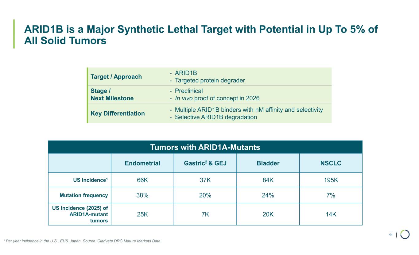 | ARID1B is a Major Synthetic Lethal Target with Potential in Up To 5% of All Solid Tumors 44 * Per year incidence in the U.S., EU5, Japan. Source: Clarivate DRG Mature Markets Data. • ARID1B • Targeted protein degrader Target / Approach • Preclinical • In vivo proof of concept in 2026 Stage / Next Milestone • Multiple ARID1B binders with nM affinity and selectivity • Selective ARID1B degradation Key Differentiation Tumors with ARID1A-Mutants NSCLCBladderGastric2 & GEJEndometrial 195K84K37K66KUS Incidence1 7%24%20%38%Mutation frequency 14K20K7K25K US Incidence (2025) of ARID1A-mutant tumors