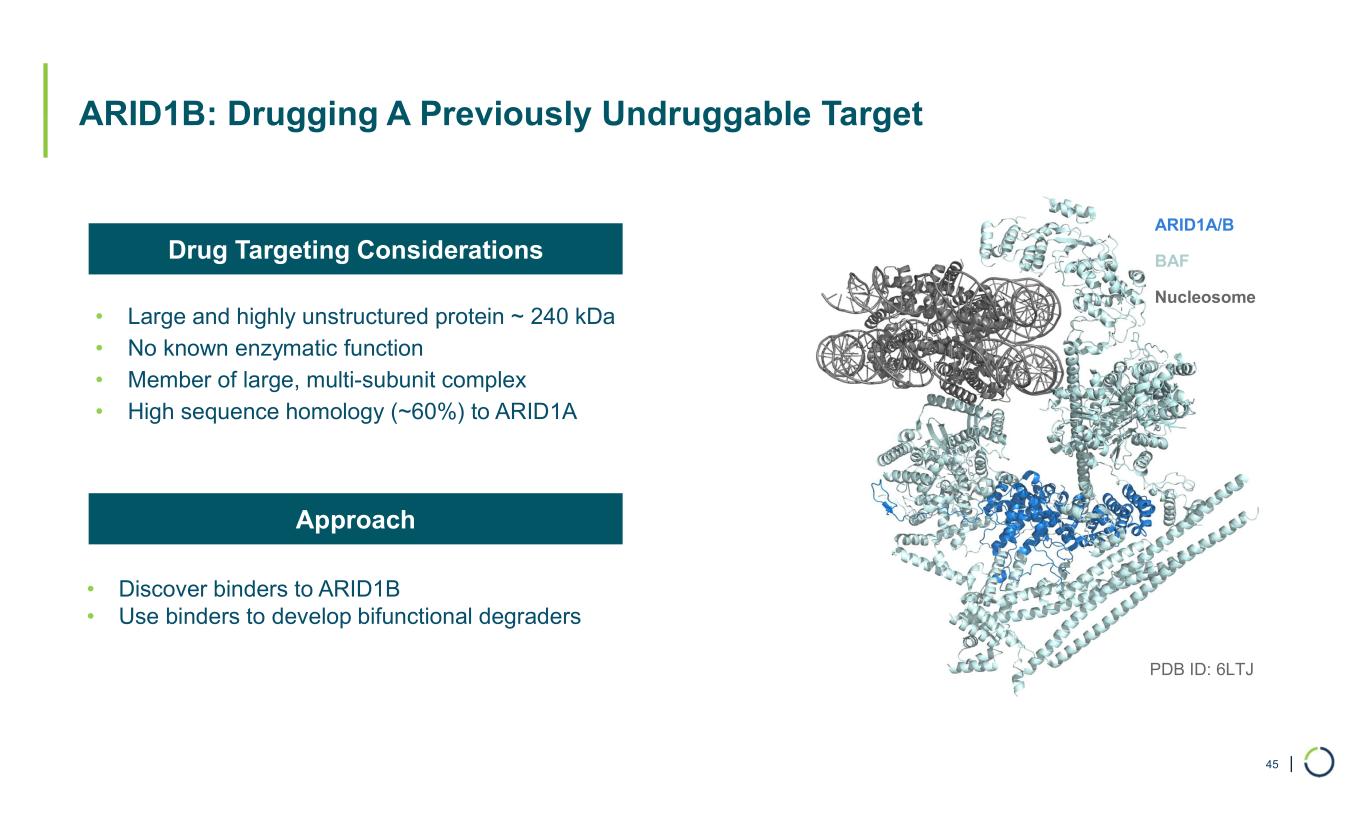 | ARID1B: Drugging A Previously Undruggable Target • Large and highly unstructured protein ~ 240 kDa • No known enzymatic function • Member of large, multi-subunit complex • High sequence homology (~60%) to ARID1A 45 ARID1A/B BAF Nucleosome PDB ID: 6LTJ • Discover binders to ARID1B • Use binders to develop bifunctional degraders Drug Targeting Considerations Approach