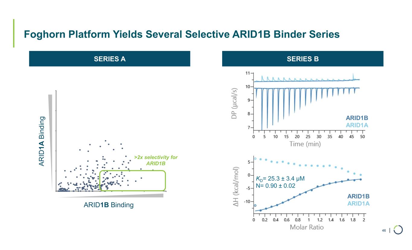 | Foghorn Platform Yields Several Selective ARID1B Binder Series 46 ARID1B ARID1A KD= 25.3 ± 3.4 µM N= 0.90 ± 0.02 ARID1B ARID1A >2x selectivity for ARID1B ARID1B Binding A R ID 1 A B in d in g SERIES A SERIES B