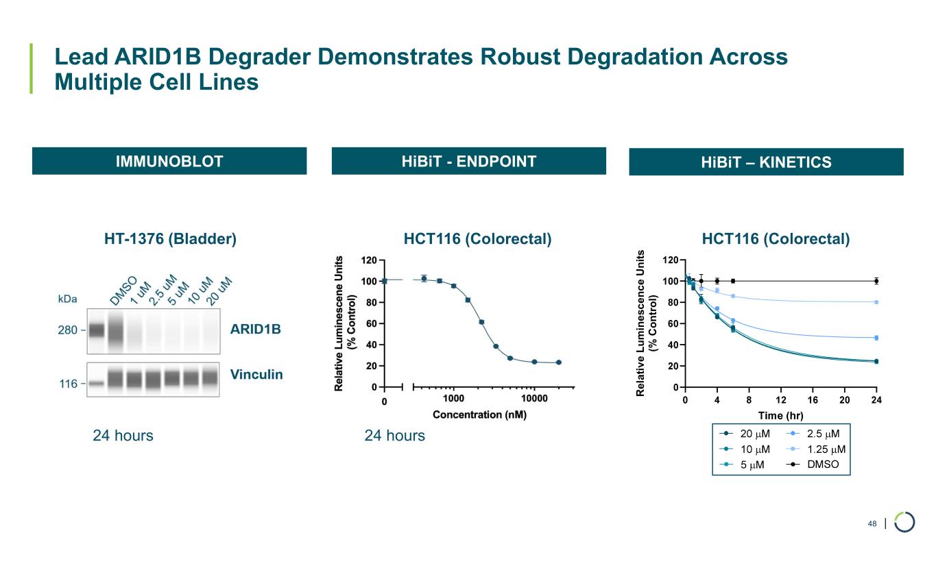 | Lead ARID1B Degrader Demonstrates Robust Degradation Across Multiple Cell Lines 48 IMMUNOBLOT HiBiT - ENDPOINT HCT116 (Colorectal)HT-1376 (Bladder) HiBiT – KINETICS HCT116 (Colorectal) 24 hours 24 hours R el a ti v e L u m in e sc e n c e U n it s (% C o n tr o l)